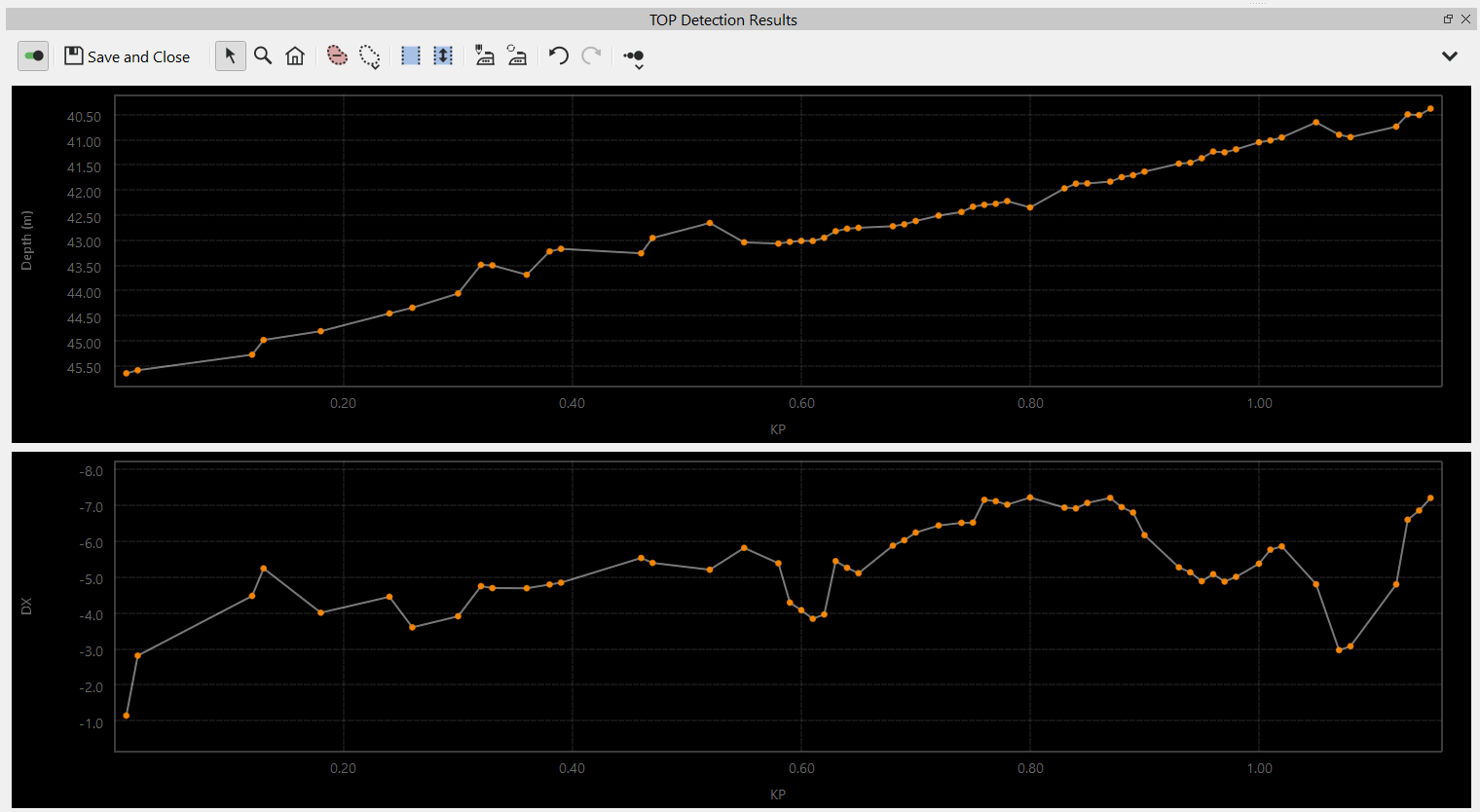 This will delete the spike and the detections will be interpolated. Click Save and you will notice the cable/pipe has updated.In TOP Detection Control it can be solved by redrawing the tracking rectangle constrained over a smaller area and do a single detection. Check if it is a good solution, then Save and you will notice the cable/pipe has updated.