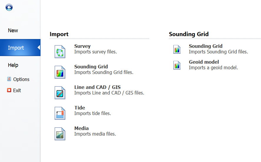 - Click on the blue Tab button at the far top left. Then select Import and then Sounding Grid and finally Geoid Model:
