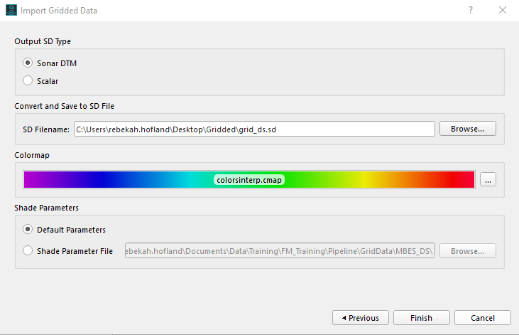On the last page of the import wizard, select Sonar DTM for the Output SD Type, and set the save location for the SD file.