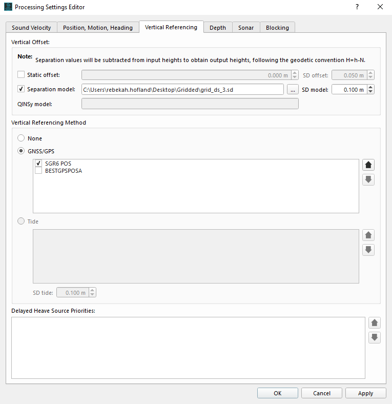 Quality check the SD model and apply the model in Qimera processing Settings, Vertical Referencing tab: