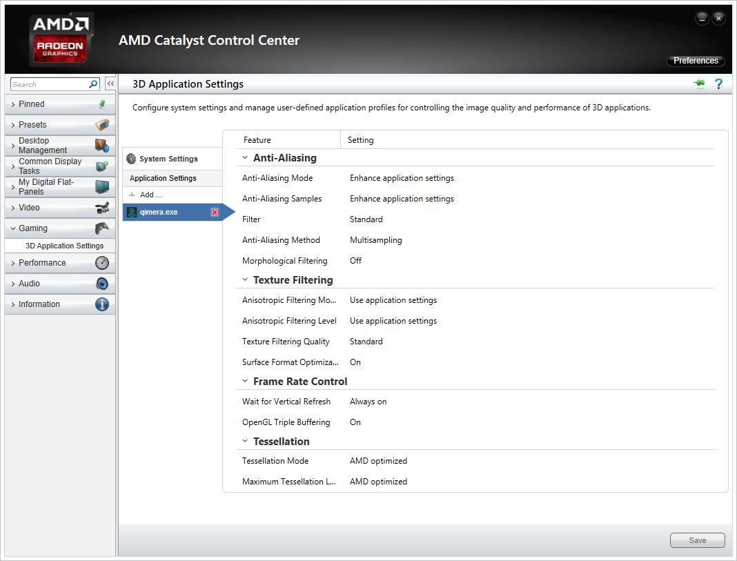 The AMD Catalyst Control Center allows for settings to be changed on a per-application level. Add Qimera to the list of Application Settings and configure the options as follows: