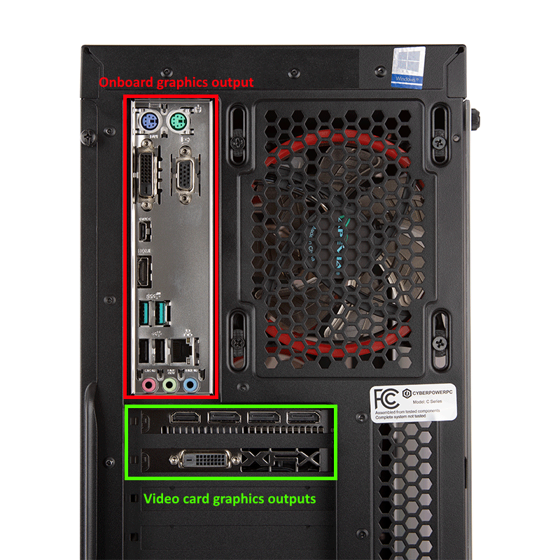 Make sure the monitor setup is connected to the video card. The cables need to be connected to the video card ports on the desktop (green box).