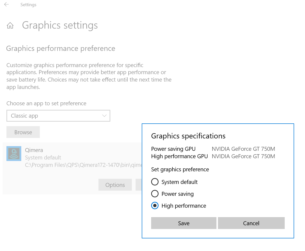 - If you see the same graphics device for both Power Saving and High Performance, then changing the settings will have no effect. If you see an integrated graphics device and a dedicated device, then the setting will have an effect.