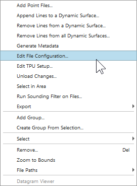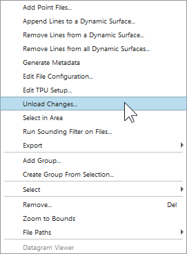 All edits made to the dynamic surface will be saved to the QPD files, these edits can be applied to the original processed point files by using the unload tool in Qimera. This tool is found under Dynamic Surface Tools in the toolbar or by right clicking on the file and selecting "Unload Changes..." (see Figure 12).