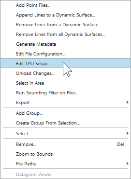 Right clicking on a Processed Point File in the Project Sources dock and selecting "Edit TPU Setup..." (see Figure 11a) will open the TPU Calculation dialog box (see Figure 11b). This is used to calculate the Horizontal and Vertical TPU values for each sounding in the file. This setup is only necessary when building a Dynamic Surface with CUBE, and can be changed at a later time.