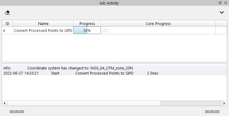 Once the Processed Points are imported to the Qimera Project, each file is scanned for metadata and converted to QPDs. You can see the progress of the scan in the Job Activity window (see Figure 6a), and after each file is scanned it will be enabled in Project Sources. You can now see the loaded center track line in the 4D scene (see Figure 6b), and can use the points to create either a dynamic or static surface. If you created a dynamic surface it is ready for either cleaning or filtering.