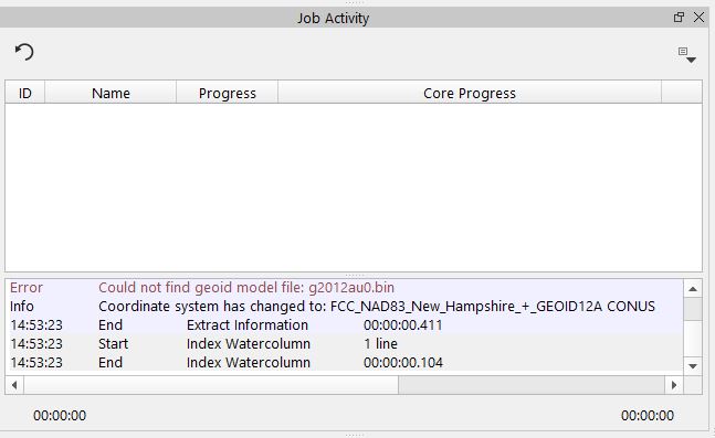 If a geoid file is specified in the Qinsy database, but it cannot be found in the appropriate folder, an error will be displayed in the Job Activity window. The error will follow this format: