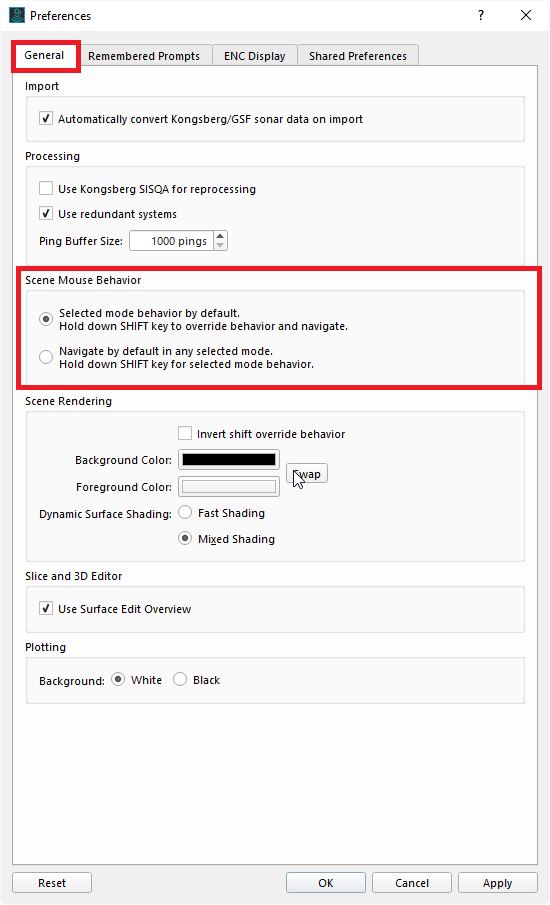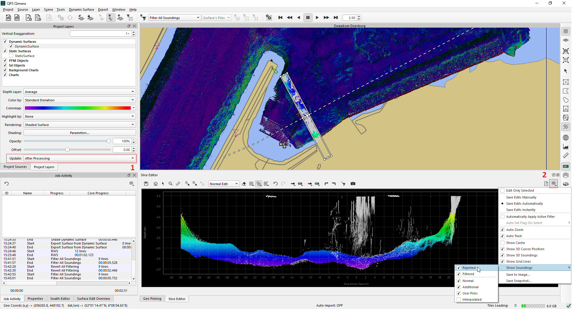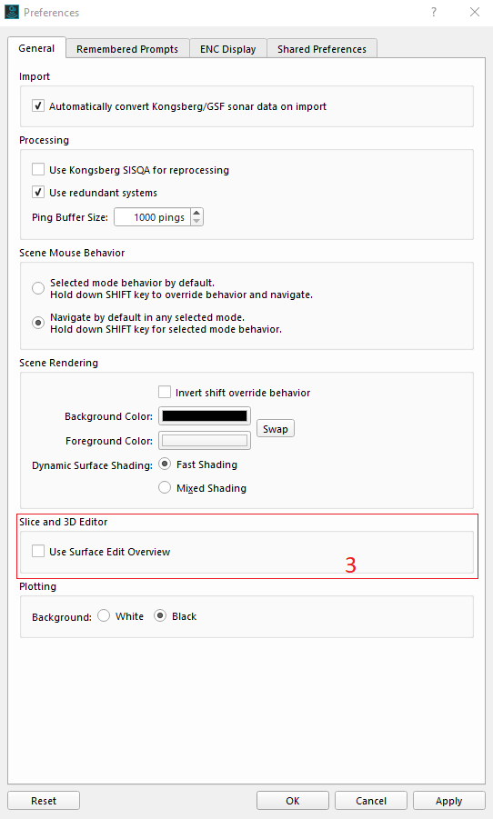 For faster editing you can select the Dynamic Surface to update "After Processing"(1), the Slice Editor is not showing rejected soundings (2) (CTRL+R), and the "Use Surface Edit Overview" in the Preferences is un-ticked (3). After cleaning, remember to change the Dynamic Surface update back to 'Always' or apply the edits (right click on the Dynamic Surface and select 'Update Dynamic Surface from Edits'). This is only necessary if you have changed the update setting.