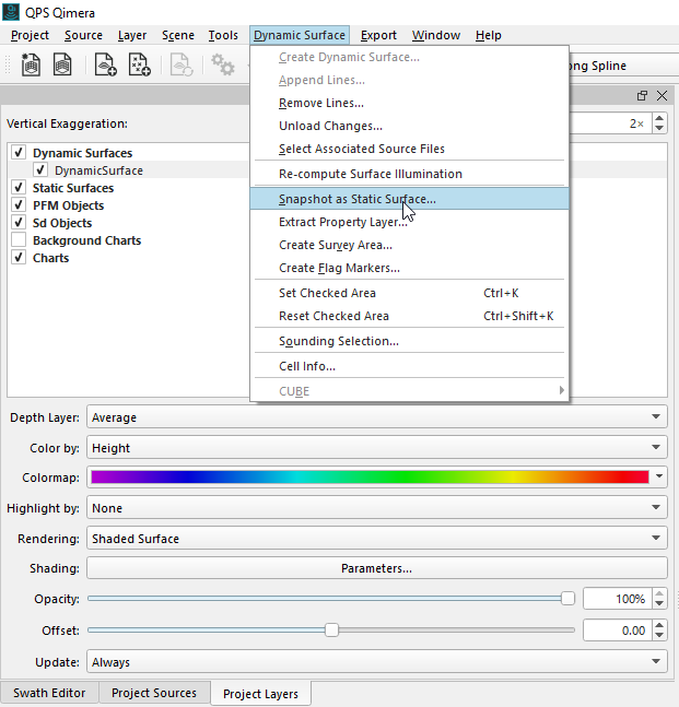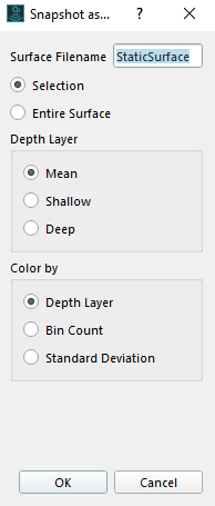 To use the snapshot function, select the Dynamic Surface, then select Snapshot as Static Surface from the Dynamic Surface dropdown menu in the Toolbar. Choose the appropriate attribute for the Static Surface, you may want to create multiple Snapshots.
