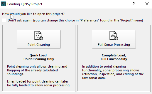 Once Qimera is started, a pop up appears with the question if you want "Point Cleaning" or "Full Sonar Processing". In this How-to the focus is on just "Point Cleaning". You will not get this choice when you have "Qimera Core" programmed to your dongle (no full sonar processing) and you will be taken directly to a point cleaning start up experience.