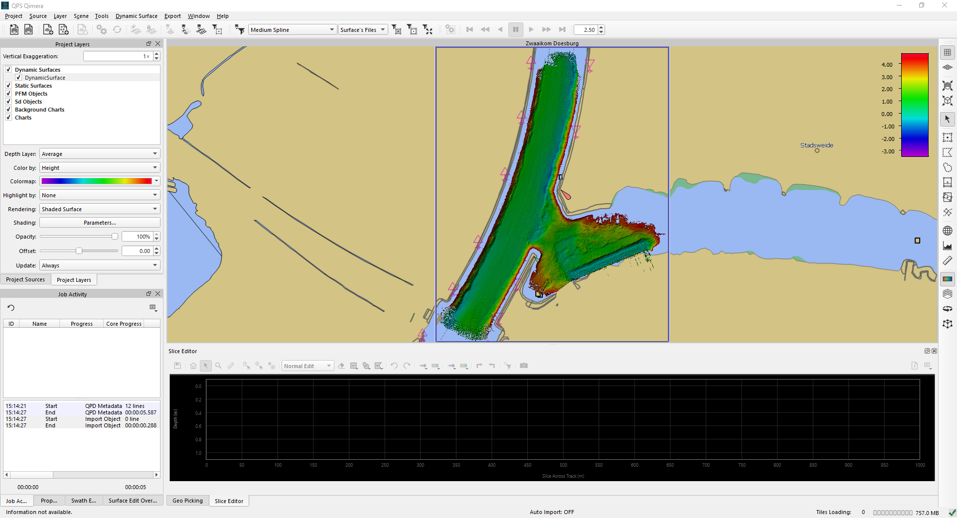 After "Point Cleaning" is selected, Qimera will automatically open the project in the chosen Qinsy folder and it will load the QPDs and Dynamic Surface if available. Qimera also will open the Point cleaning workspace, which contain the appropriate docks and windows for the data cleaning.