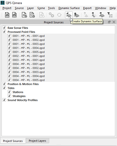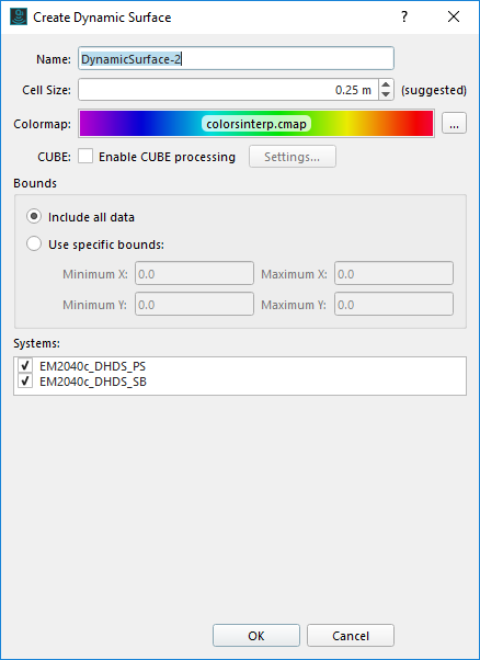 If no Dynamic Surface was created during the survey, you can create one now. Select the *.qpd files and click on the "Create Dynamic Surface" icon . Now you can define the name and set the cell size. A suggested cell size will be given to you based on the average water depth (from the QPDs) and the average beam angle of a modern mapping system.