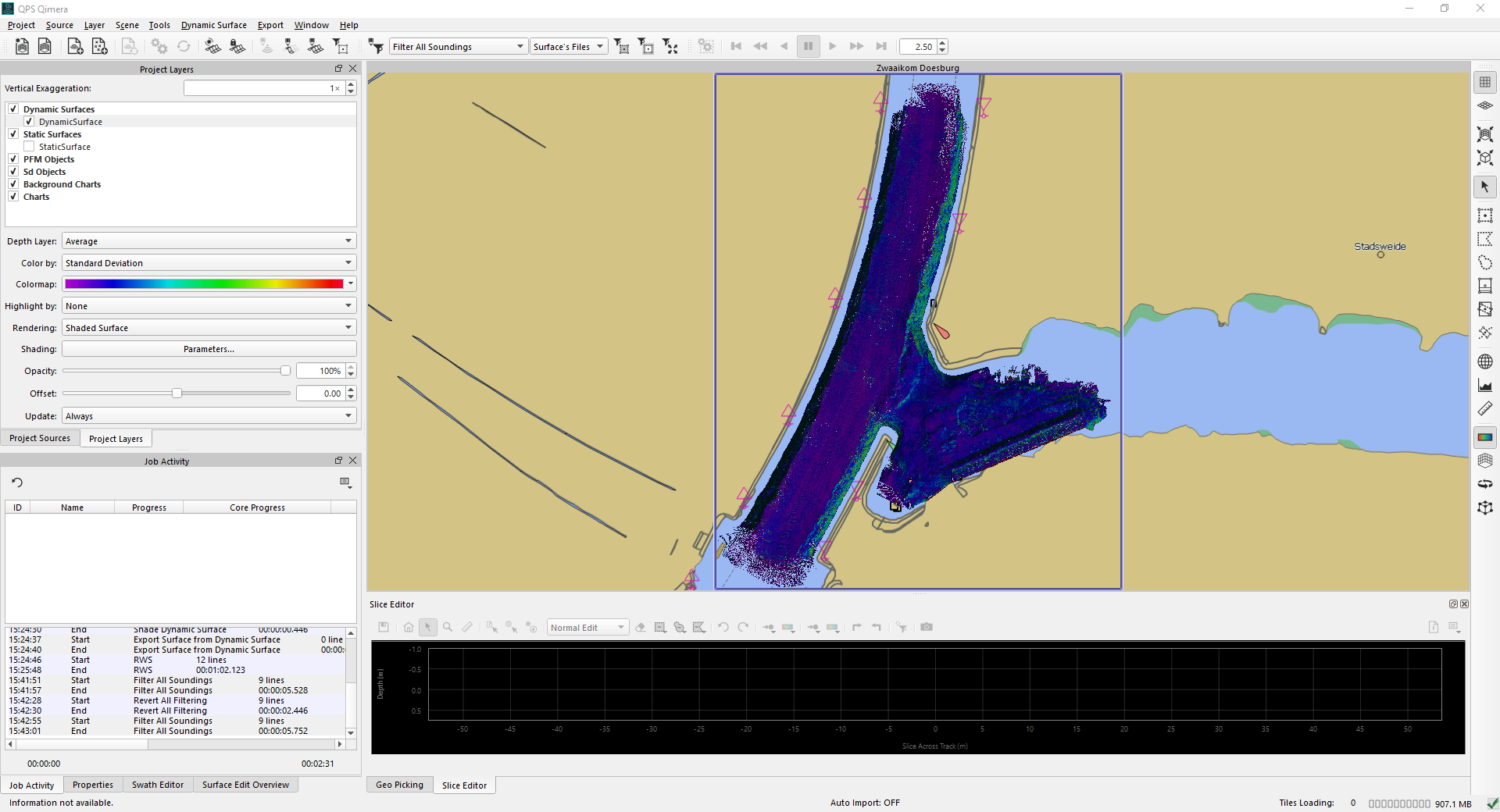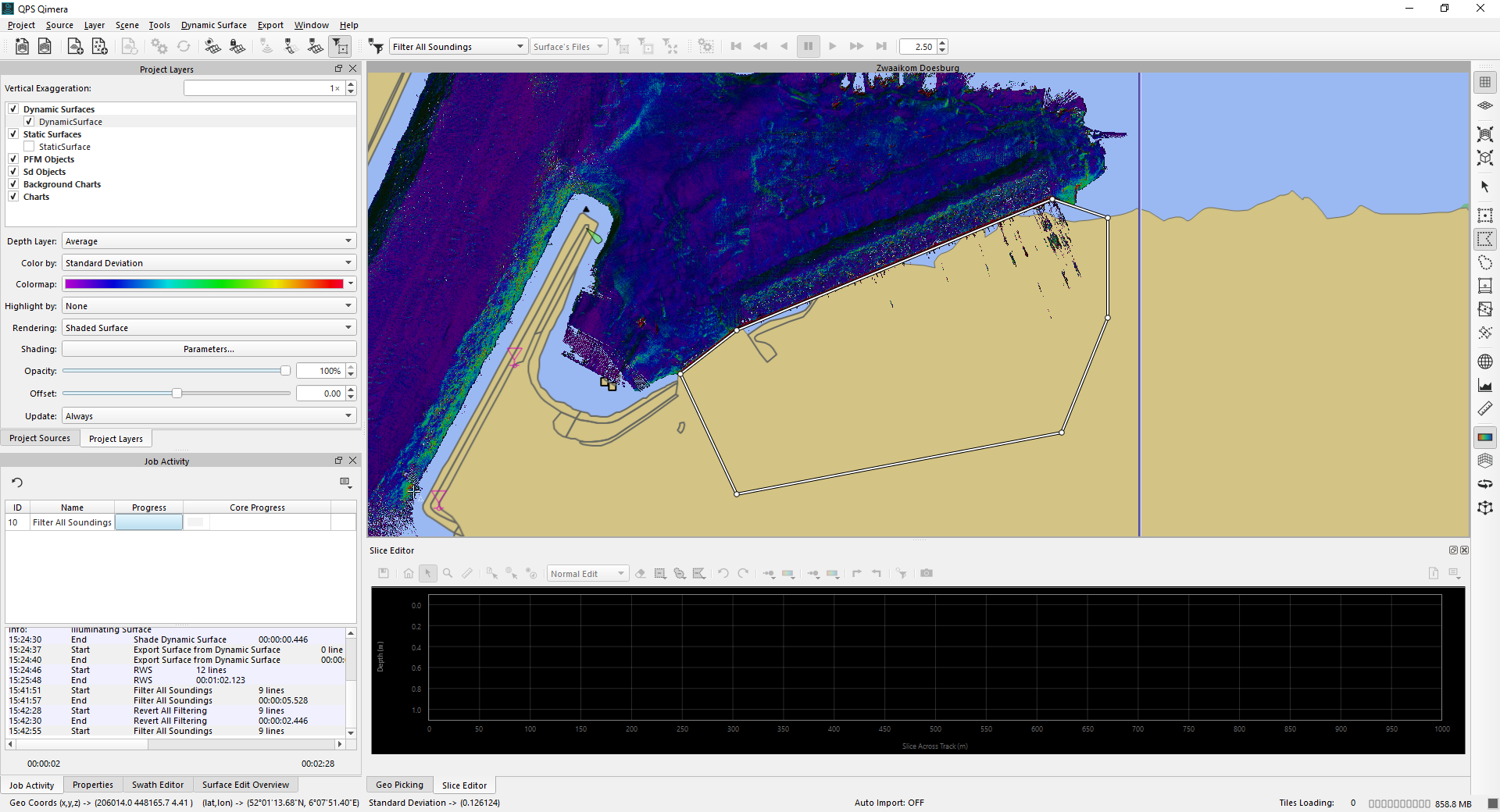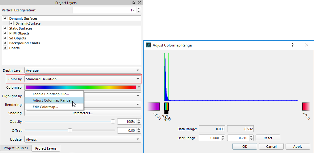 Before you do any data cleaning, you may find it appropriate to do some quick quality control, to see where your data needs special attention regarding the cleaning. This can be easily done by setting the color coding of the Dynamic Surface to "Color by" : Standard Deviation. In Project Layers Dock, mouse select the Dynamic Surface, then select "Color by" and select Standard Deviation.