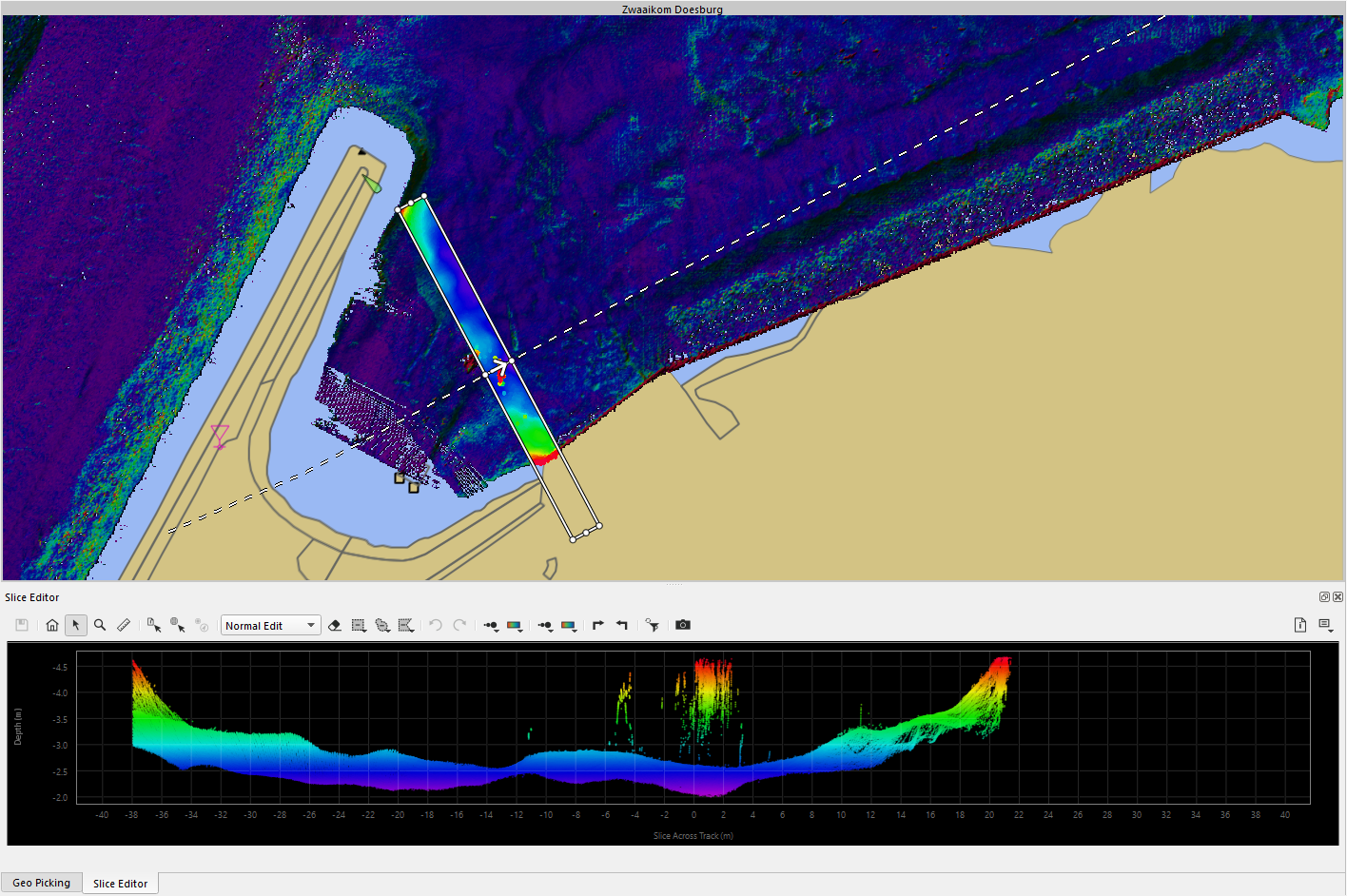 For this How-to, the Scroll Slice Select is used . With this button the user can define a path that the selection walks along. To move the selection, use the W&S buttons to move forward and backwards and the Q&E buttons to rotate the slice box. To edit the soundings launch the Slice Editor or press "2".