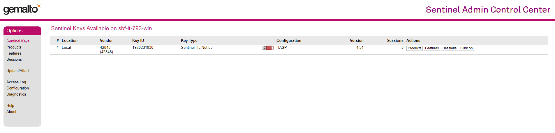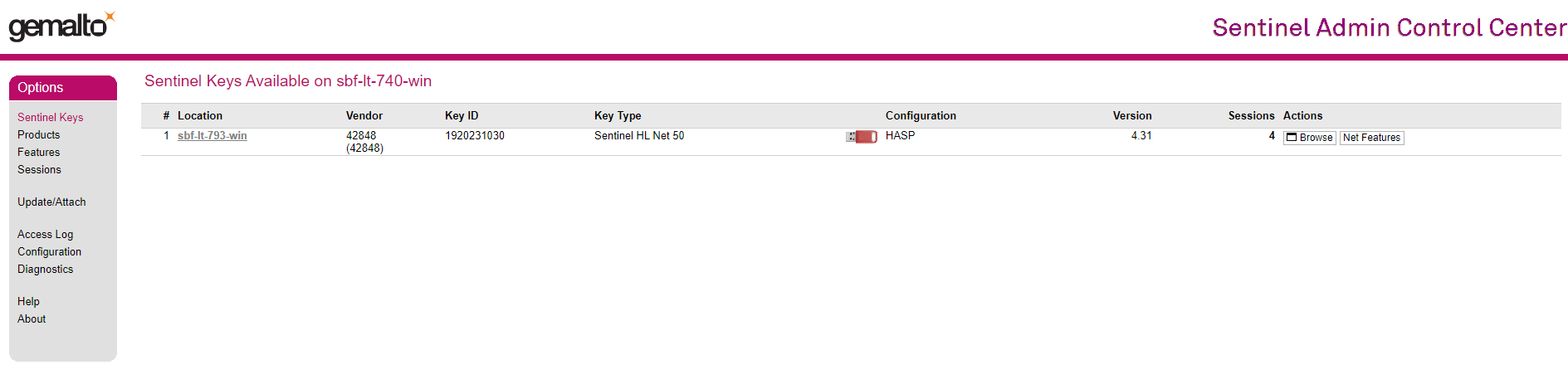 Next, navigate to the same website (http://localhost:1947/) on the PC's that will be acting as clients. Again, under 'Sentinal Keys', the dongle should be visible with its location showing the host PC: