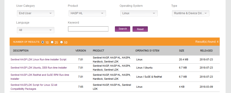If the link doesn't work, search for "sentinel linux hasp driver". One of the links should be more specific than the general Sentinel download page. If the general sentinel page: https://sentinelcustomer.gemalto.com/sentineldownloads/ is all that's available, change the search parameters as follows: