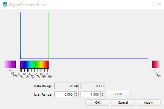 Determine the line that requires Time Series improvement by assessing the data/survey. A good way to visualize any errors in your data is to set the Dynamic Surface attribute to 'Color by' Uncertainty (95% c.l.), and then adjust the colormap to emphasize outliers. The Adjust Colormap Range dialog will come up, you can left-click and right-click on either side of the histogram to adjust the range.