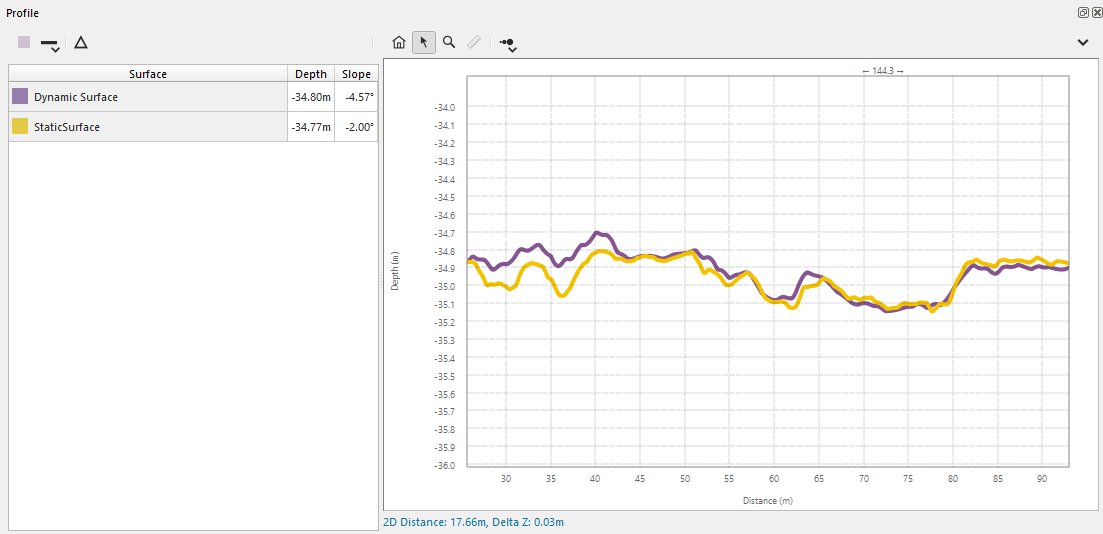 The Static Horizontal Shift Tool allows a user to align a Dynamic Surface from a survey to another reference surface that could be either a Dynamic or Static Surface. The user does this by selecting a number of corresponding matching point pairs on each surface, which are referred to as reference points. Qimera will then compute an average XY offset between all reference pairs that can then be applied to the raw sonar files of the Dynamic Surface the user desires to shift. Typically, the user picks corresponding features on the seabed or corresponding features of line objects such as contours to use as reference points. The user can pan or zoom around either surface view and the same corresponding geographic location will be at the center of the view when the views are "locked".