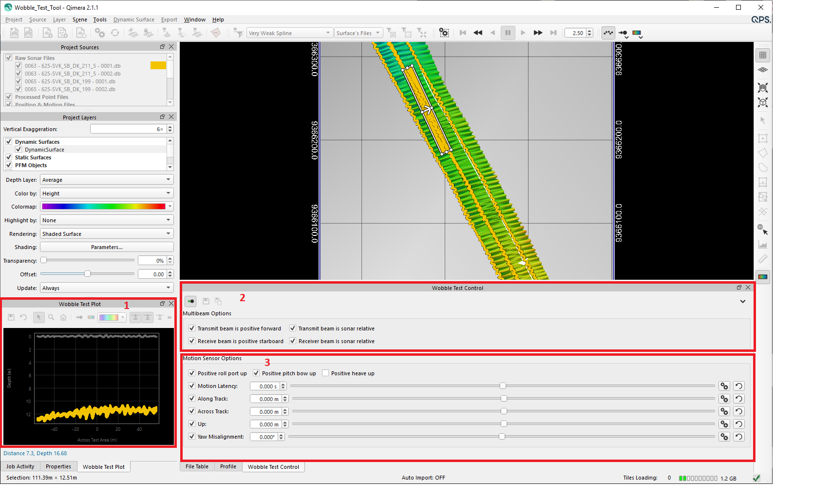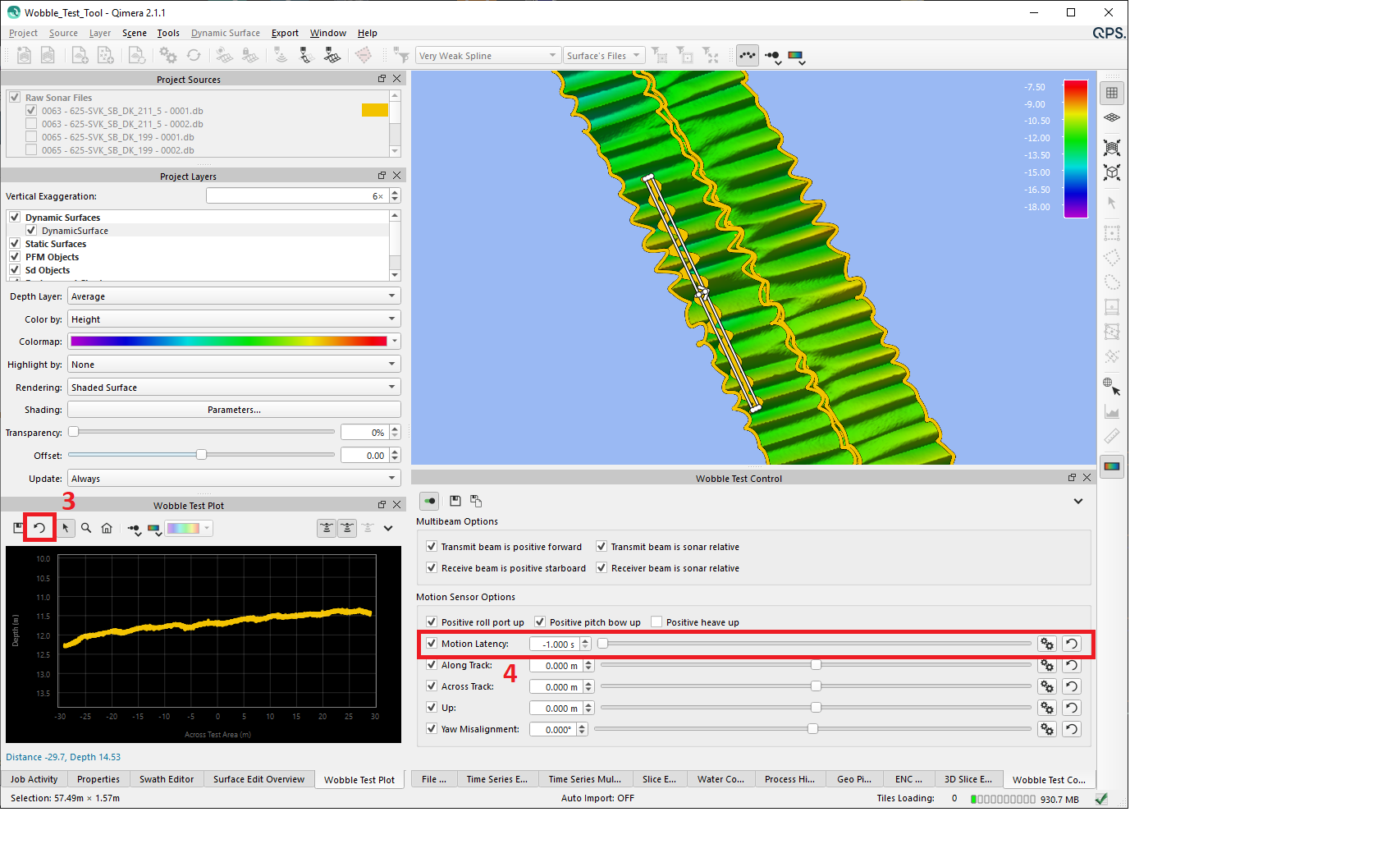 - It's best to first build a dynamic surface from the line you intend to use the Wobble Analysis Tool on. Select the sonar file you will be using the Wobble Analysis Tool on from within the Project Sources window (2). This window can be toggled in the 'Window' pull-down menu (3).