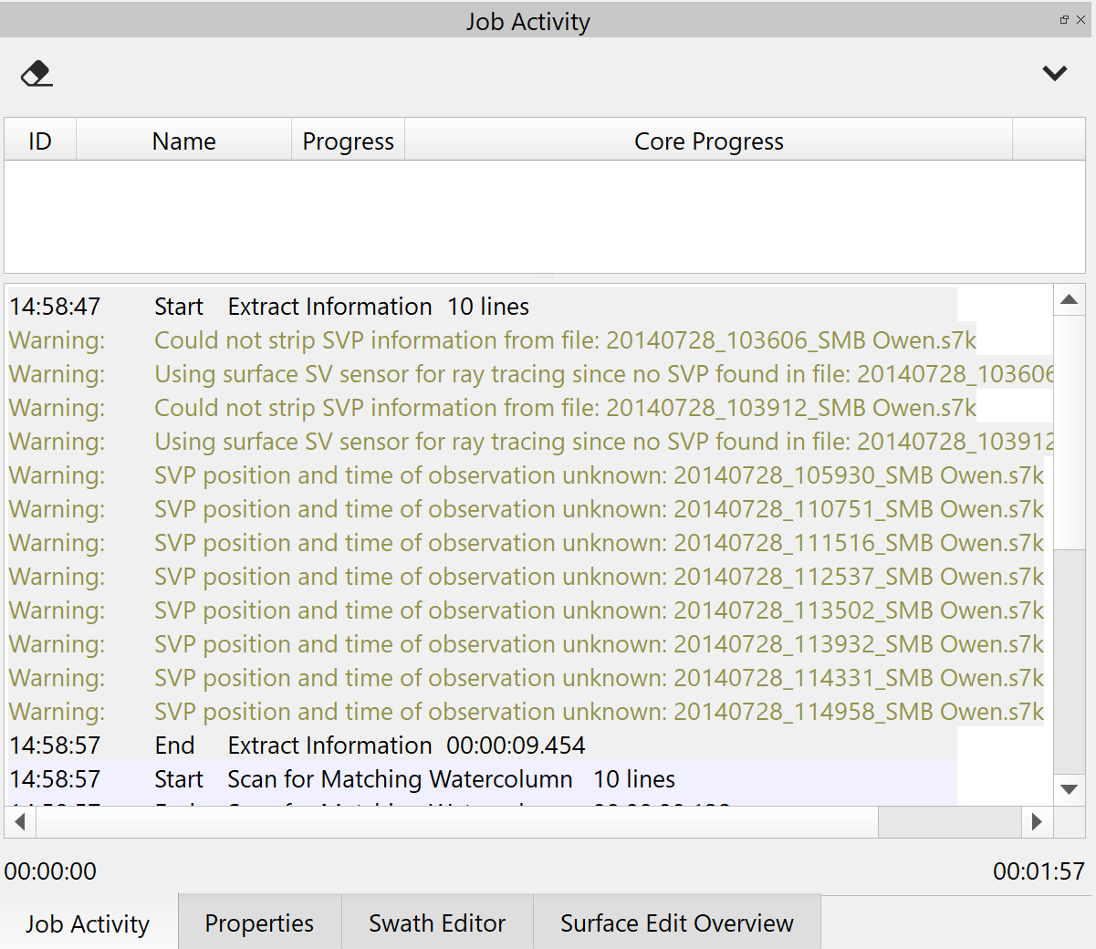 8) For this example dataset, the Job Activity Dock displays a warning about SVP position and time. This just means that the SVP position and time were not available in the file or could not be read, so Sound Velocity Processing Strategies based on location or time won't be available unless you provide this information in the SVP Editor.