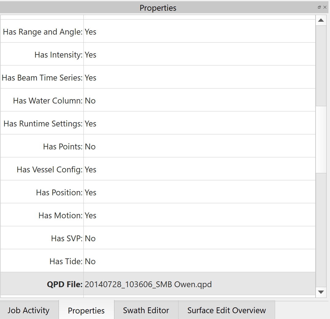 In this example of the Properties Dock, you can see that Beam Time Series, Vessel Configuration, Position, and Motion were all extracted from the file, but that there was no Water Column, SVP or Tide.