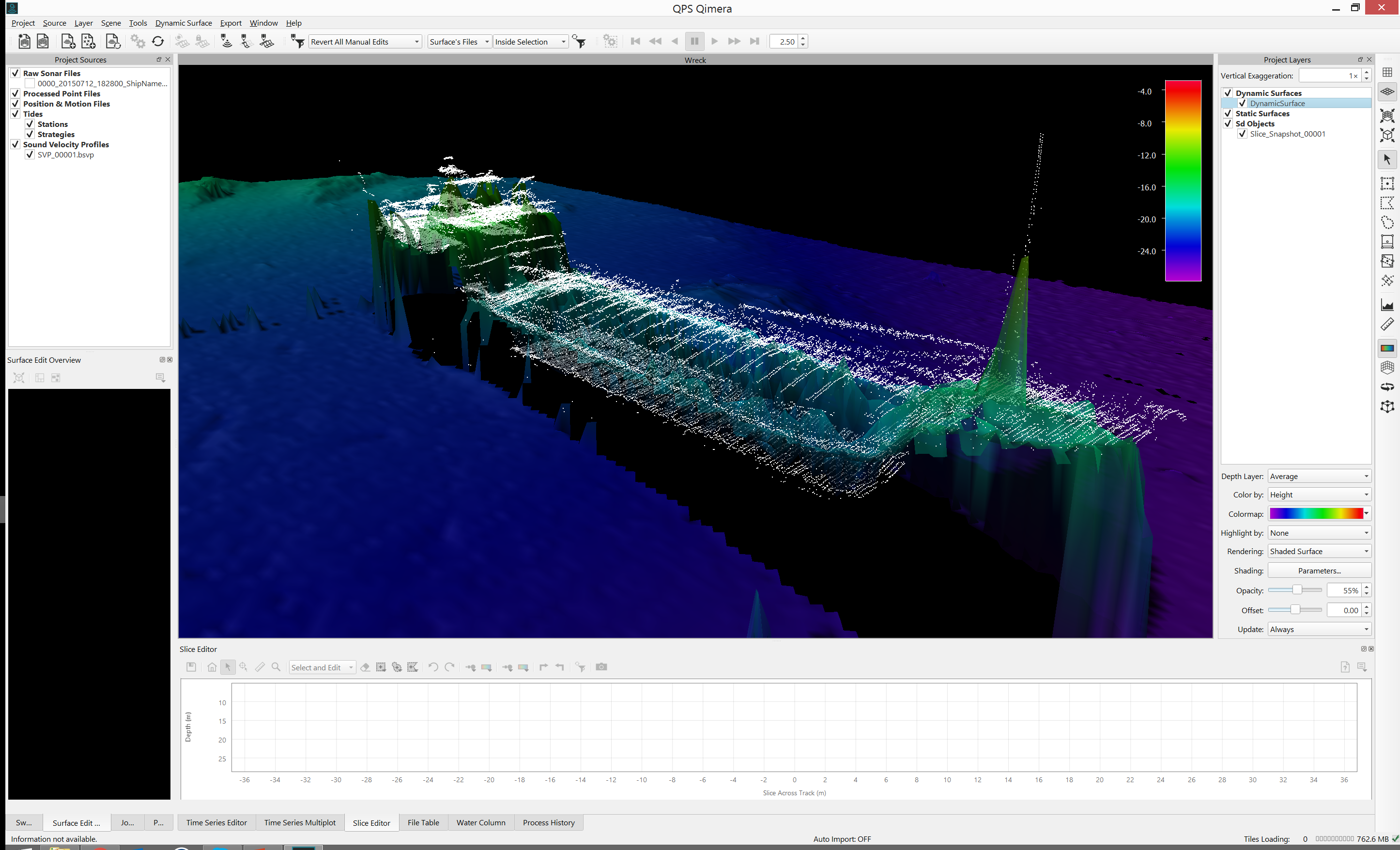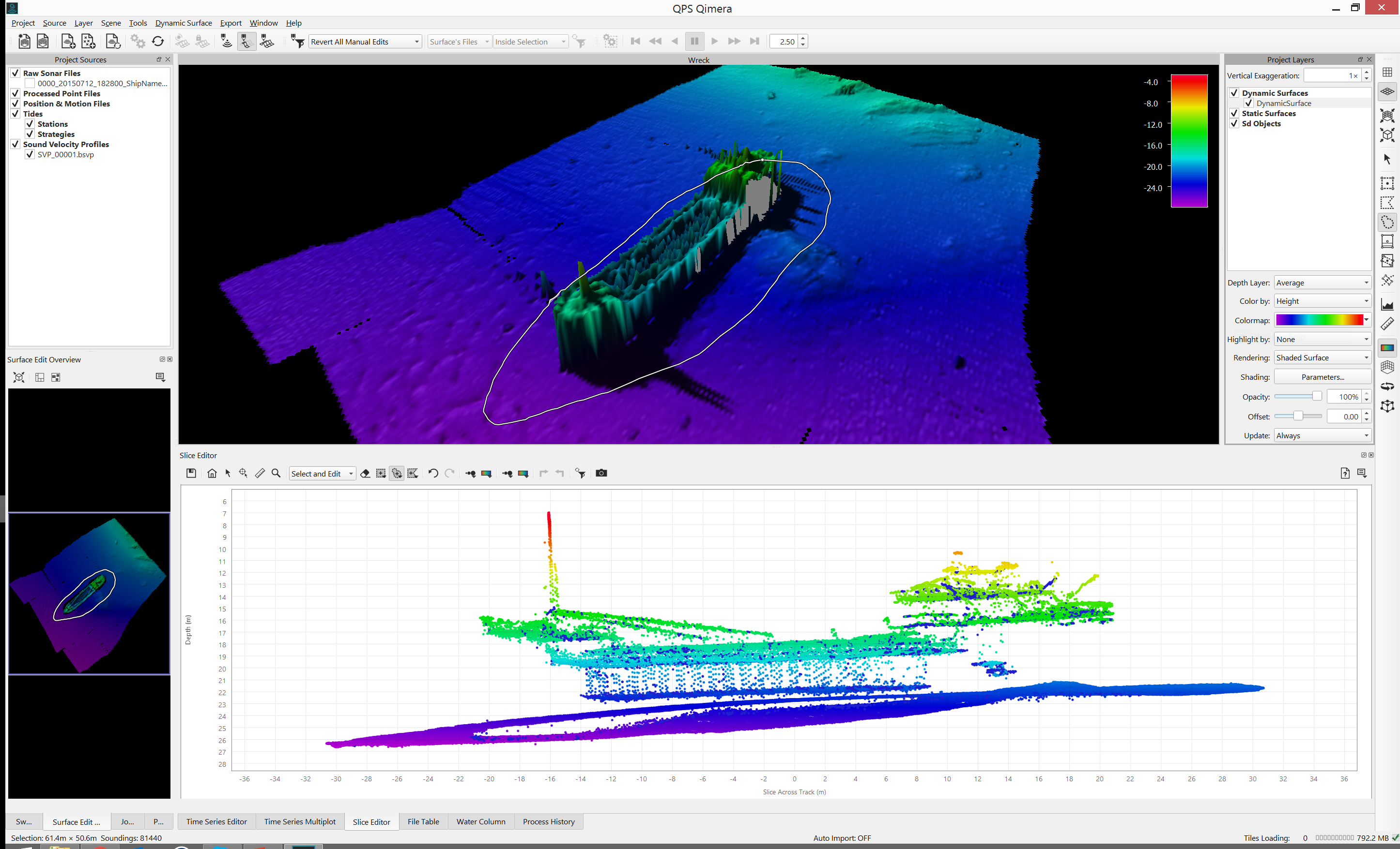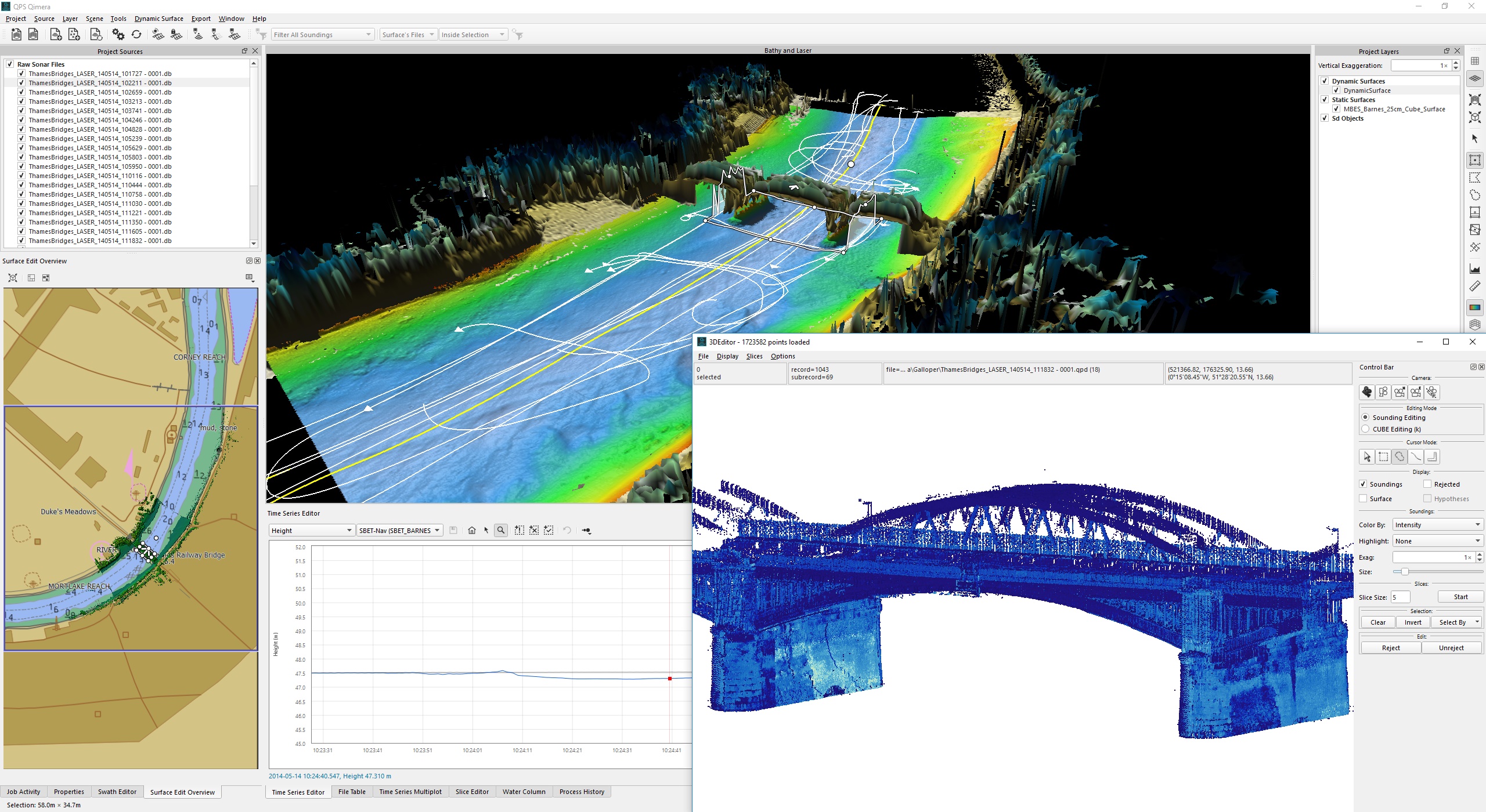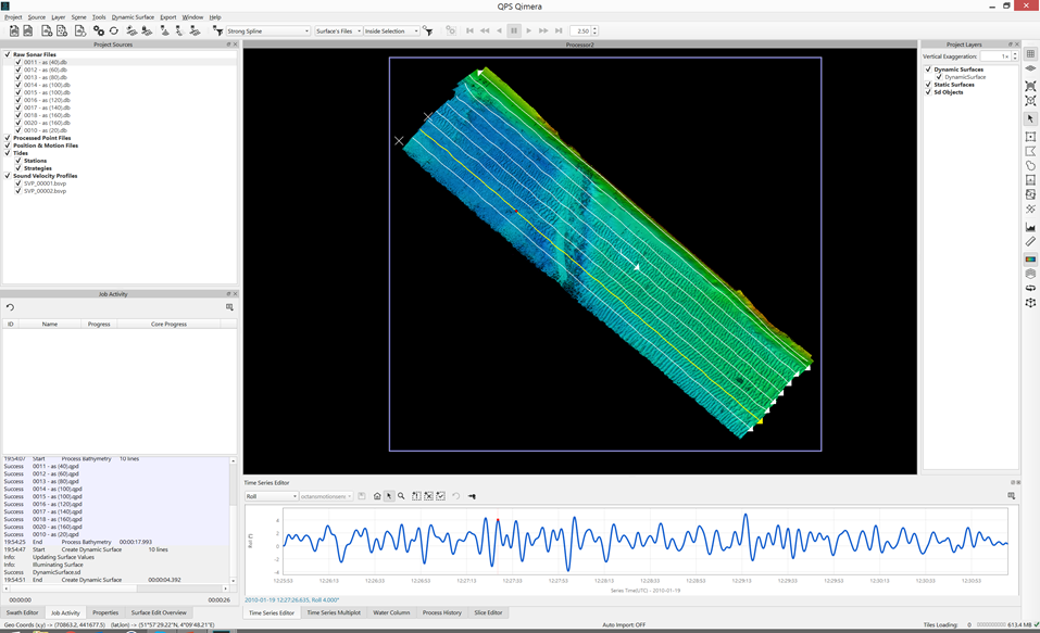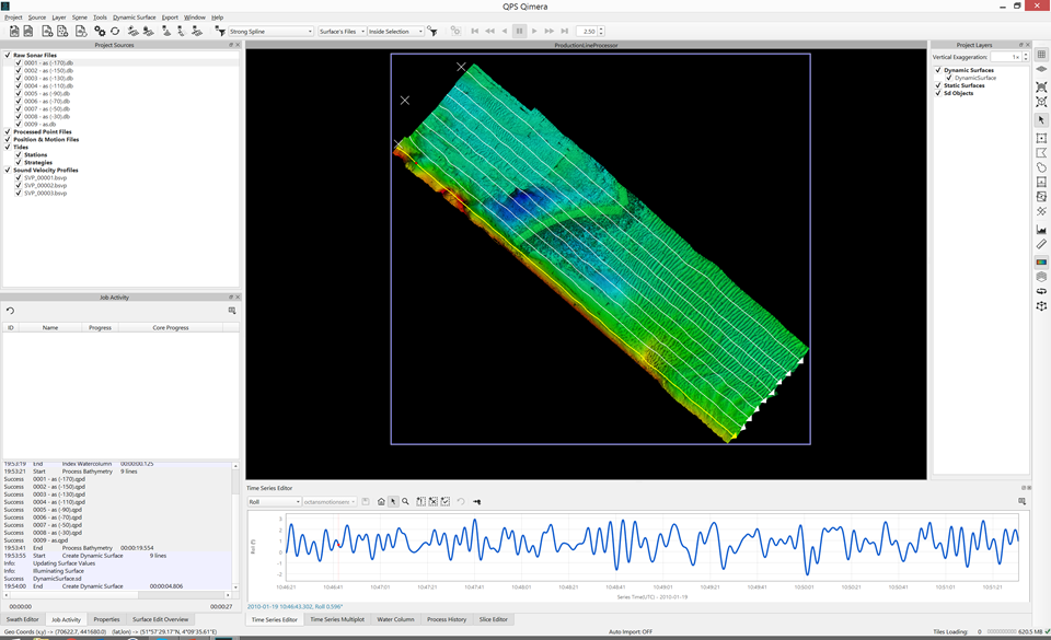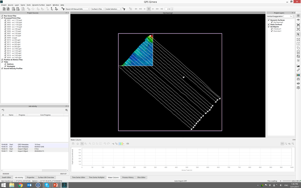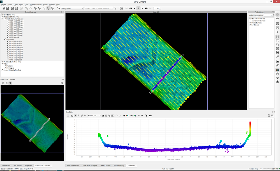 The series of images below show two separate sets of data being processed to get from raw sensor data to georeferenced soundings. The third image shows the QPD results from the first two small projects being merged into an assembly project, with the Slice Editor being used to verify the line up between the two different data sets. It's important to note that the QPDs are shared between the processing project and the main project and it is up to you to ensure that you do not attempt to write to QPDs at the same time. The workflows for which this is meant to be used largely protect against this since data should not be submitted for inclusion in the master project until the mathematical processing is done, i.e the mathematical processing project is done and is closed. The main processor then pulls the data into the main project with the understanding that the mathematical processing project will not be re-opened unless they surveyor is directed to do so, which should only be necessary if problems occur. A little bit of human coordination goes a long way in orchestrating this and avoids complex resource locking schemes in other software packages which sometimes lock users out of their data. Humans can be smart and can coordinate, we've made just enough functionality to let you coordinate and work together.