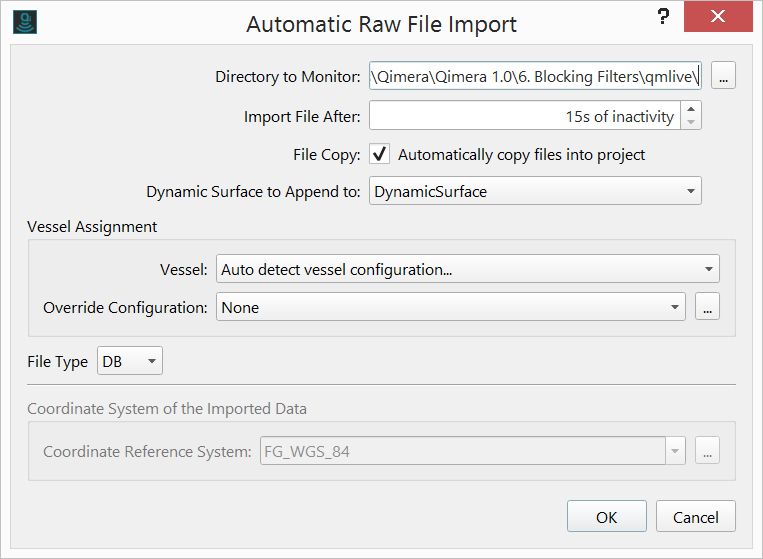 Qimera should not open QINSy projects while QINSy is running, acquiring data or generating Dynamic Surfaces. Data loss may occur if this warning is not heeded. Qimera is currently meant to only open QINSy projects after they are acquired. If you need to use Qimera with QINSy in a real-time environment, it is recommended that you configure QINSy to copy .db files to a backup directory at the end of each line. You should then create a new Qimera project and use Qimera Live (available as of Qimera 1.1) to monitor the backup directory, import the data, process it and add it to a Dynamic Surface.