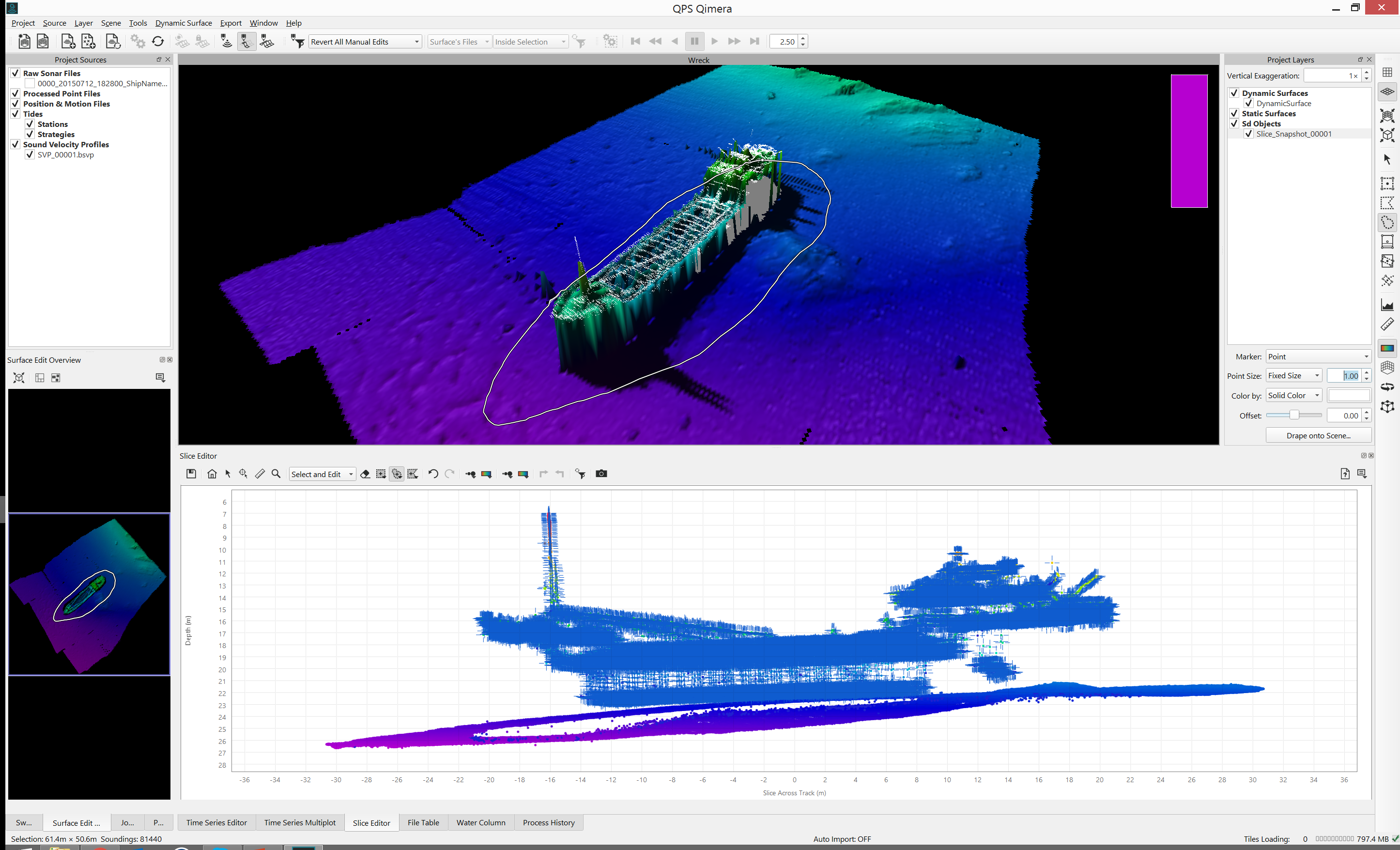 Do a quick snapshot of soundings in any sounding editor to quickly capture point clouds into the Scene to stage for further analysis or simply for marking up areas of interest. A snapshot can be done from the Swath Editor, the Slice Editor and the 3D Editor. This is a great way to mark up areas of interest that need further investigation but you can also use this to easily isolate points of interest for 4D Scene building for Fledermaus visualization, analysis or movie making. The points are saved in Fledermaus .sd format for direct use in Qimera or Fledermaus, but they can also be exported as ASCII XYZ for quick load into other software applications. The sequence of images below shows the Slice Editor being used to isolate the soundings collected over a wreck.
