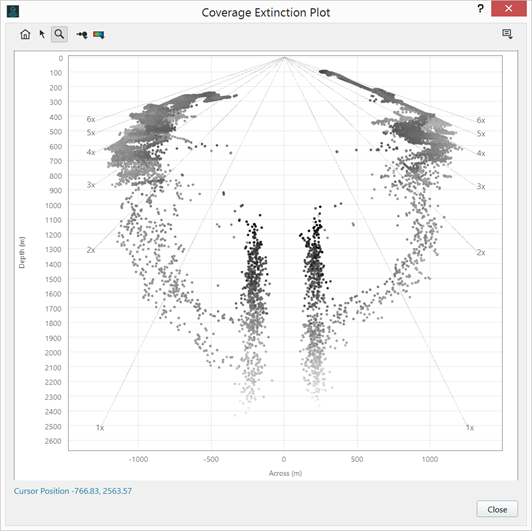 - Coverage Extinction Plot. You can now plot the outer soundings for a specified set of survey lines to establish the coverage capabilities of your multibeam system. This is handy for assessing coverage capabilities as a function of water depth to compare against the manufacturer's specifications.