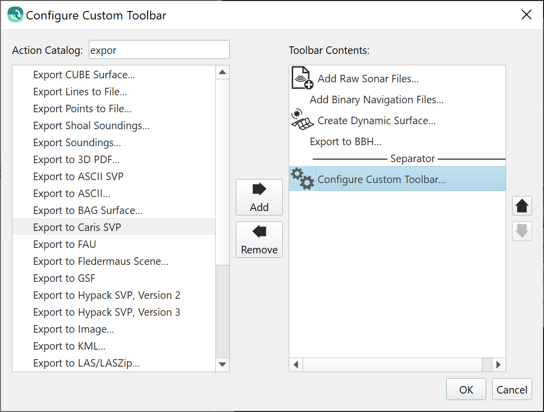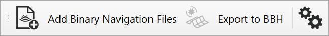 You can display your own custom toolbar on the main application interface, you can configure it to add buttons for any action from any menu. Below we show how one might configure a custom toolbar for a simple workflow of importing raw sonar data, adding binary navigation files, creating a Dynamic Surface and exporting a BAG.