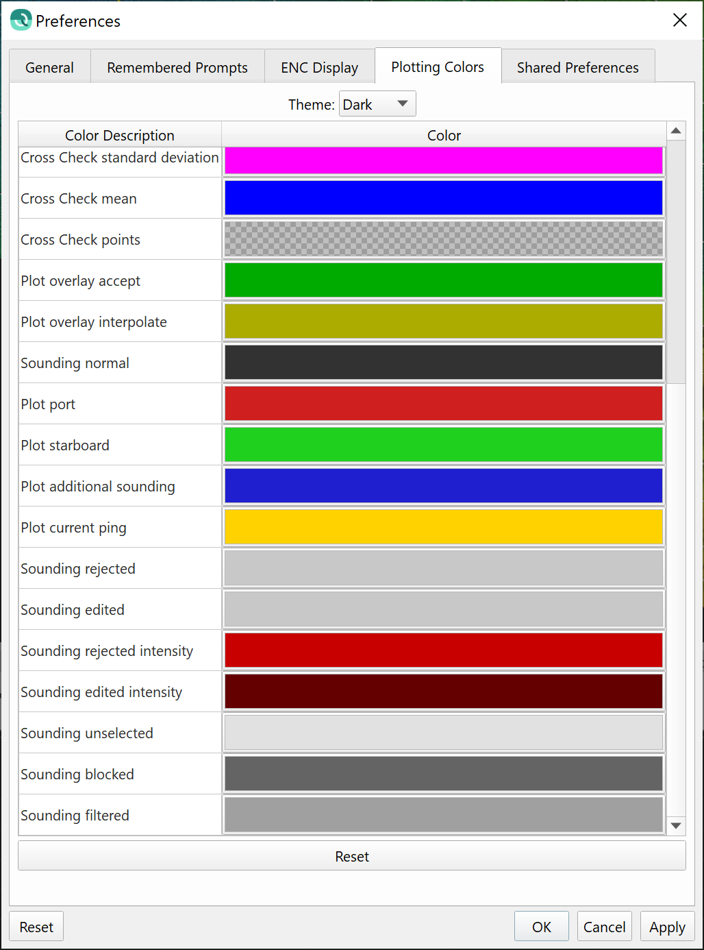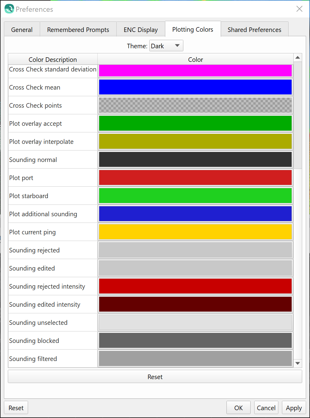Qimera has many plots, from point editors like the Slice Editor to data analysis tools like the Cross Check tool. We've centralized point and line coloring options for all of the various plotting tools in the Preferences menu in a new tab, as shown below. Users can choose from a Dark or Light theme, or come up with their own custom theme. The most common use case that drove this development was a desire to change the color of rejected points in the Slice Editor. Once we started down the path of satisfying that request, we decided to expand it to cover all of the plotting tools.