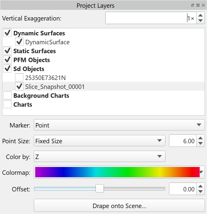 Finally, we've added the ability to adjust the color map, set the color map range and edit the color map for Point objects in .sd format. These are typically created from snapshots within Qimera (using the Swath Editor, the Slice Editor or the 3D Editor) or from importing from Fledermaus, or after importing points for visualization. An example of the change in interface is shown below. Once the Color by option is changed from Fixed Color, the Colormap selection widget will appear below the combo box that lets you chose the variable to color the points by.
