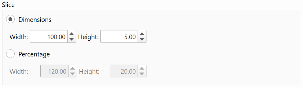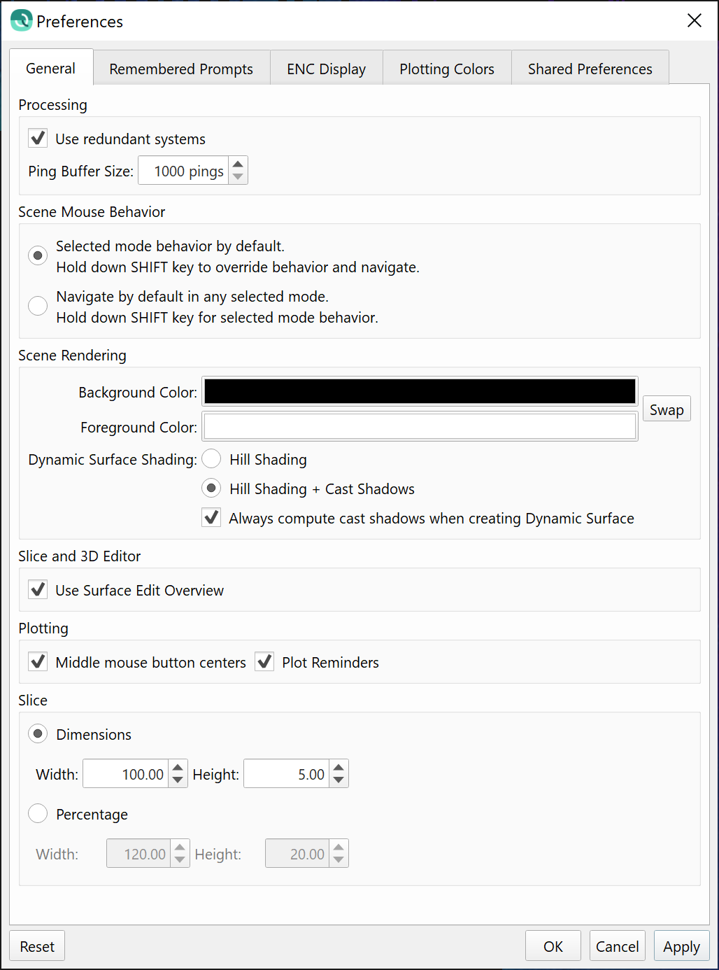 There is also now the capability to set a default set of dimensions for the inner slice for both Fixed Slice and Free Slice modes. You can access this from the General tab on the Preferences dialog, as shown in the two images below. The new capability allows users to choose a default set of dimensions, in survey units, for the width and height. Alternately, these dimensions can be configured to be a percentage of the outer selection of the Fixed or Free Slice outer rectangular selection. The two examples below show the inner box chosen to be 100 m wide by default and 5 m high. For the percentage option, the inner slice will be drawn 120% of the width of the outer selection and the height will be 20% of the outer selection's height. Setting the default inner slice dimensions to a fixed set of dimensions allows users to quick draw outer slice selections and then skip having to resize the dimensions of the inner slice.