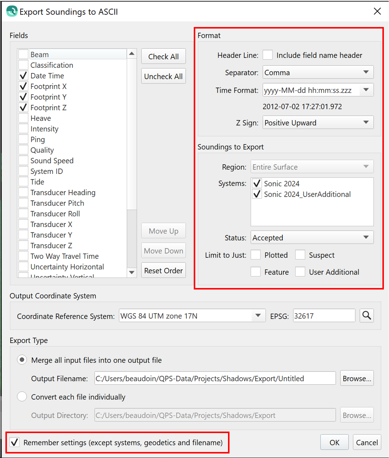 The layout of the exporter dialog has been improved to have all user selection elements visible at the top level. This was done to reduce human error during export since the settings that were previously only visible when launching a secondary dialog were sometimes forgotten by users. Also, there is a new tickbox that allows users to have the dialog remember their last export settings. This covers the majority of the settings on the dialog with the exception of the selected systems (which can vary between different raw sonar files), geodetic settings and whether or not to export a merged file or single files.