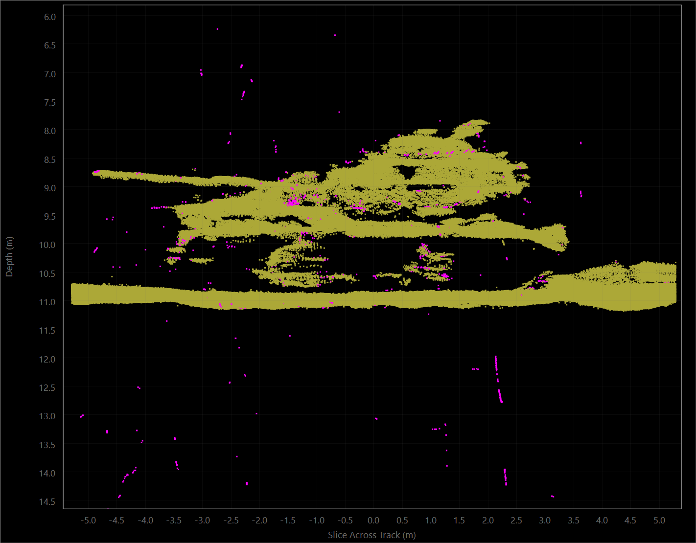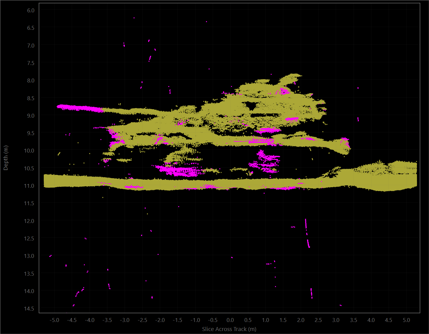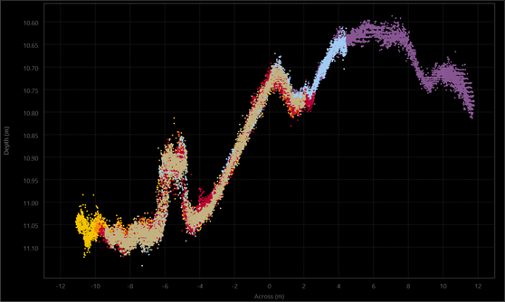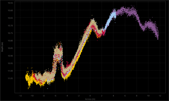 The tool uses the same principle as the Slice Editor in that the user chooses a rectangular area in which to solve for vertical offsets. The point cloud is displayed in order to guarantee that there is a "human in the loop" to override any problematic solutions. As with all plotting tools in Qimera, you can easily save screen captures of the plot for before/after comparisons and reporting purposes.