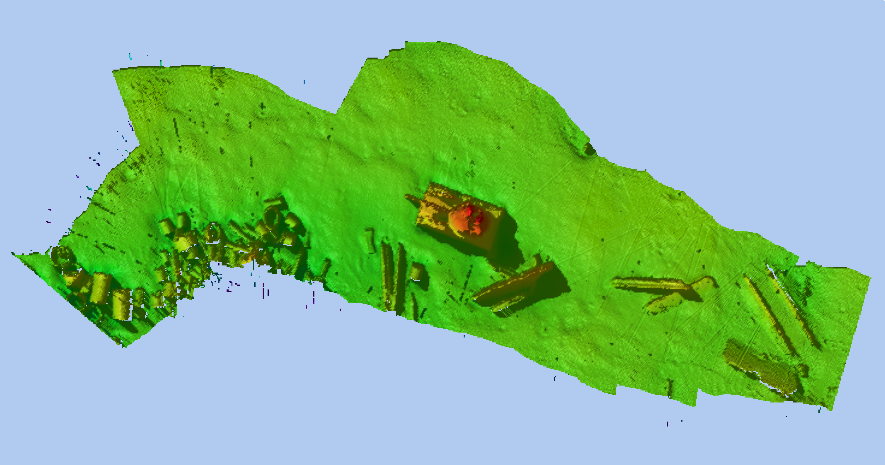 Why do we name this filter "True 3D"? We do so because it handles the case of true 3D objects like you would get from laser scanning of buildings or port facilities, or mapping of seabed engineering structures where vertical objects and overhangs are the norm. All other filters available in Qimera assume a seafloor or surface for which there is only one vertical value in any given cell on the surface. There are many mapping applications where this is not true though, and this filter is designed to work for these kinds of situations. The examples below show data from an R2Sonic Sonic 2024 operating in 700 kHz UHD mode over a submerged tank in an artificial reef site. Data courtesy of R2Sonic.
