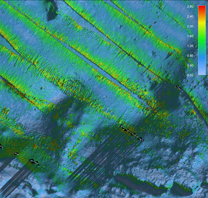 How does this work in practice? Here is a sequence of images showing the effects of a single pass of this new filter and also the result of a stacked iterative sequence of the filter. The grids are color coded by uncertainty and the cast shadows highlight the presence of many spikes as well as areas of general high uncertainty in the overlap between survey lines.