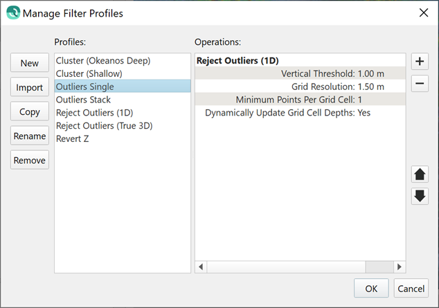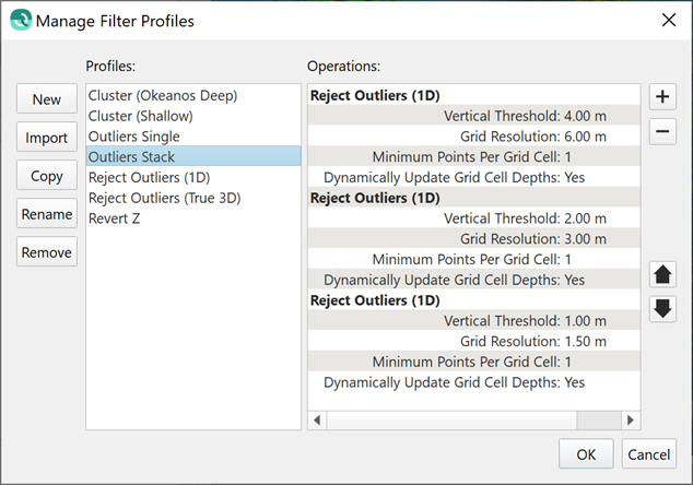 The true power in this type of filter is to create a sequence of such filters, which is possible in the dialog to manage filter profiles, as shown below. The first iteration uses a very large cell size and a large threshold; this removes extreme outliers. Once this is done, a second iteration then repeats the operation for a smaller cell size and smaller threshold. The sequencing is necessary in some cases when extreme outliers can bias the average when using a small cell size.