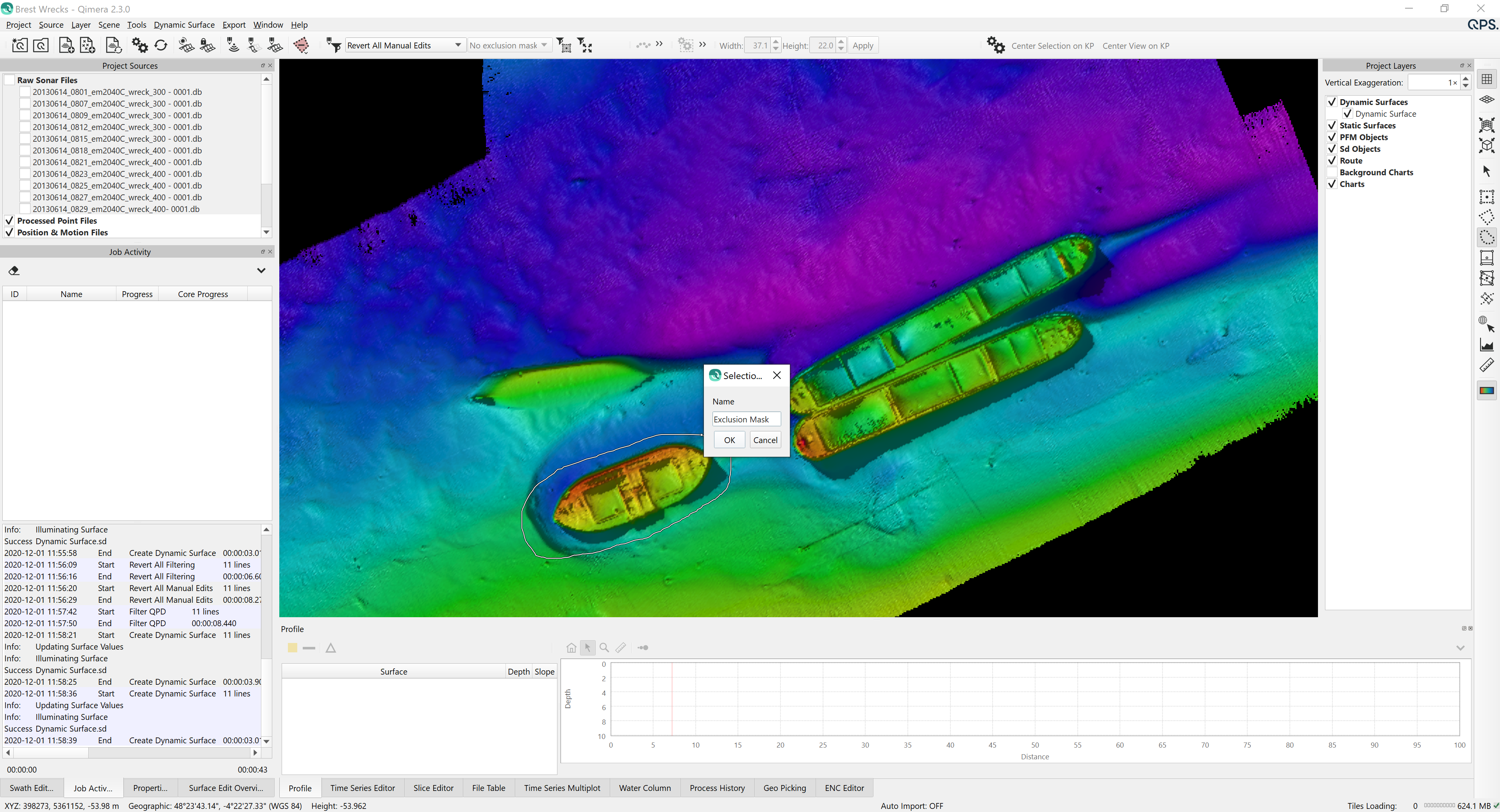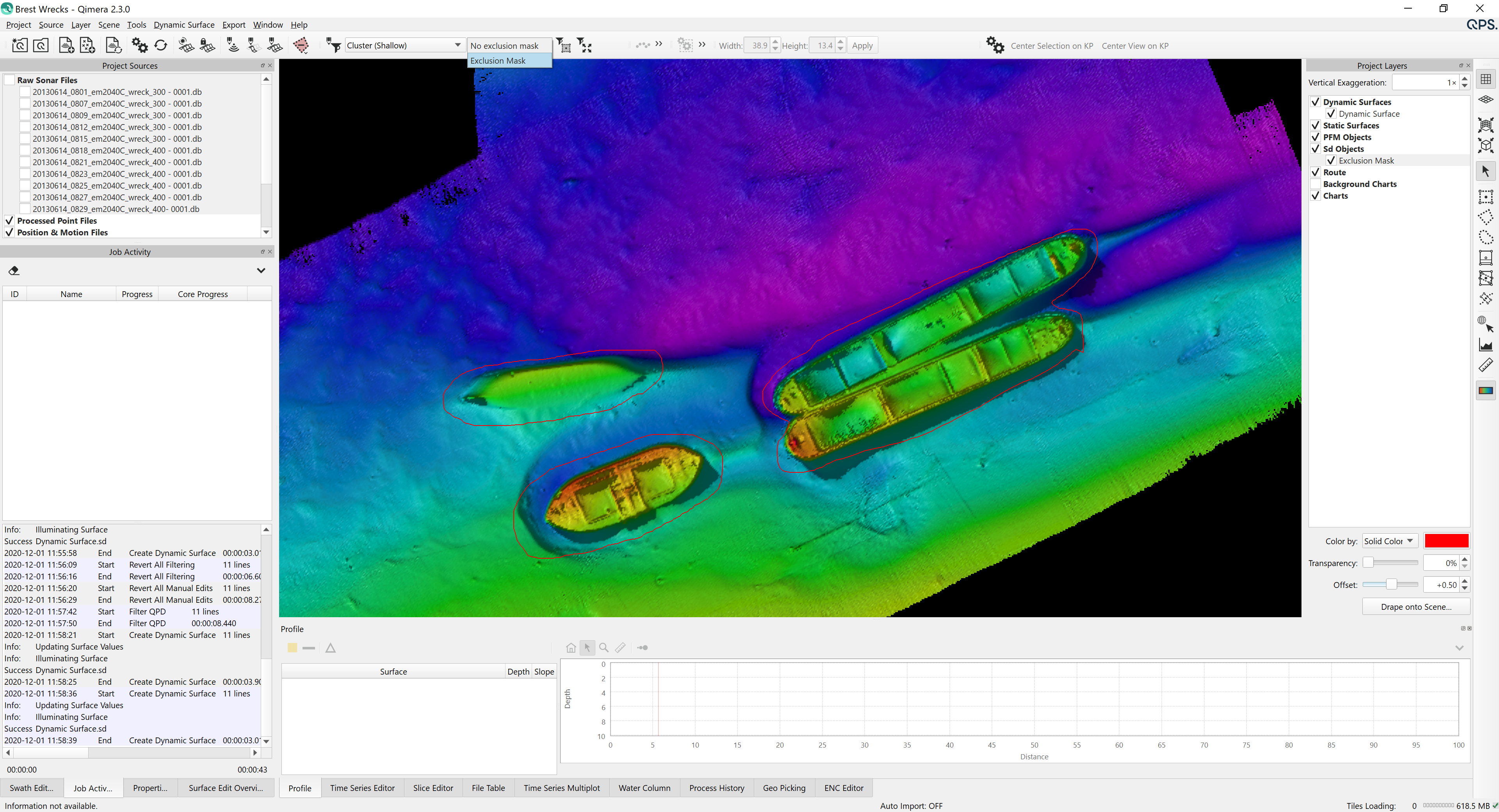 Once the multi-polygon exclusion mask is complete, it can be used as an Exclusion mask in a number of tools. Below you'll see how this is used in the Filter Toolbar to prevent running the Cluster filter over the wrecks where a manual inspection may be necessary to prevent points from being over-filtered.