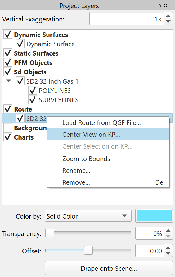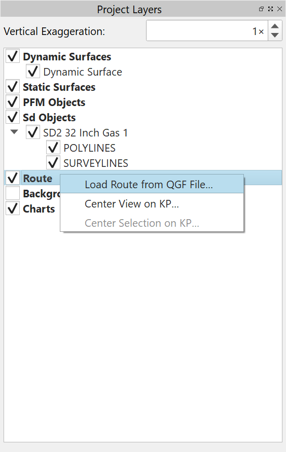 Similar to the improved support for QGF files, there is now support for KP, or Kilometer Post, in Qimera. This is common in offshore work such as cable/pipeline work where it is necessary to be able to think in terms of linear distance along a cable/pipeline corridor. To access this functionality, Qimera will let you designate a QGF file as a "Route". Note that the QGF file may have been already imported into the project via the auto-import functionality described above, setting the Route is a separate action entirely since not all QGF users will have the need for KP, nor will all QGF files have KP embedded.