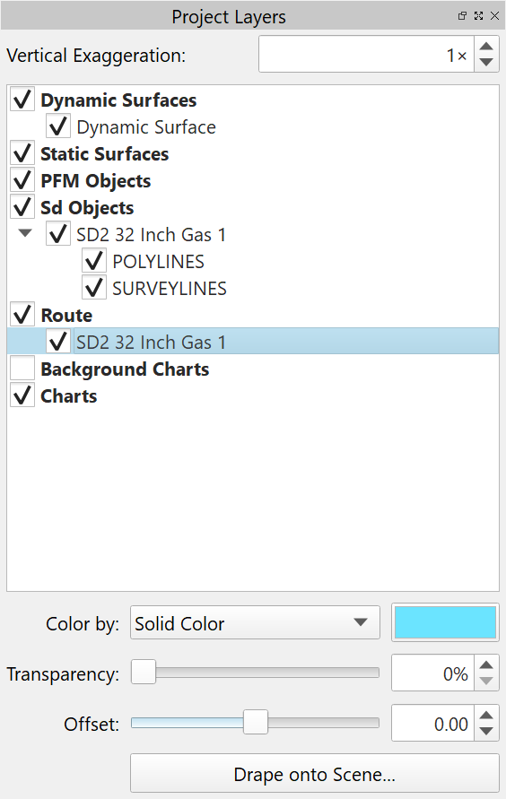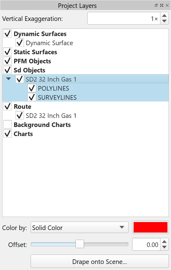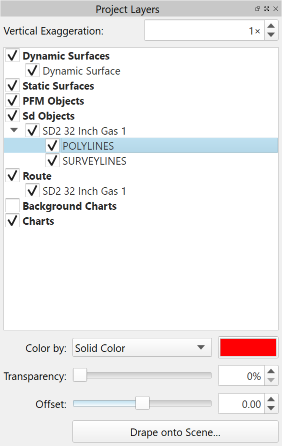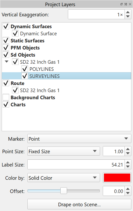 When opening a Qinsy project for the first time, any QGF files will be found and converted to .sd format and added to the Project Layers. Since .sd objects can only contain one object type per file (e.g. points in one file, lines in another), a QGF is "exploded" into a points and a lines .sd files. These are added under a single group with the group name coming from the QGF. Visibility can be controlled separately for points and lines as well using the normal mechanisms. Direct QGF support, i.e. support that does not require file conversion, will not come until the Fledermaus 8 Tempest visualization engine is integrated into Qimera but this provides a more streamlined experience in the meantime.