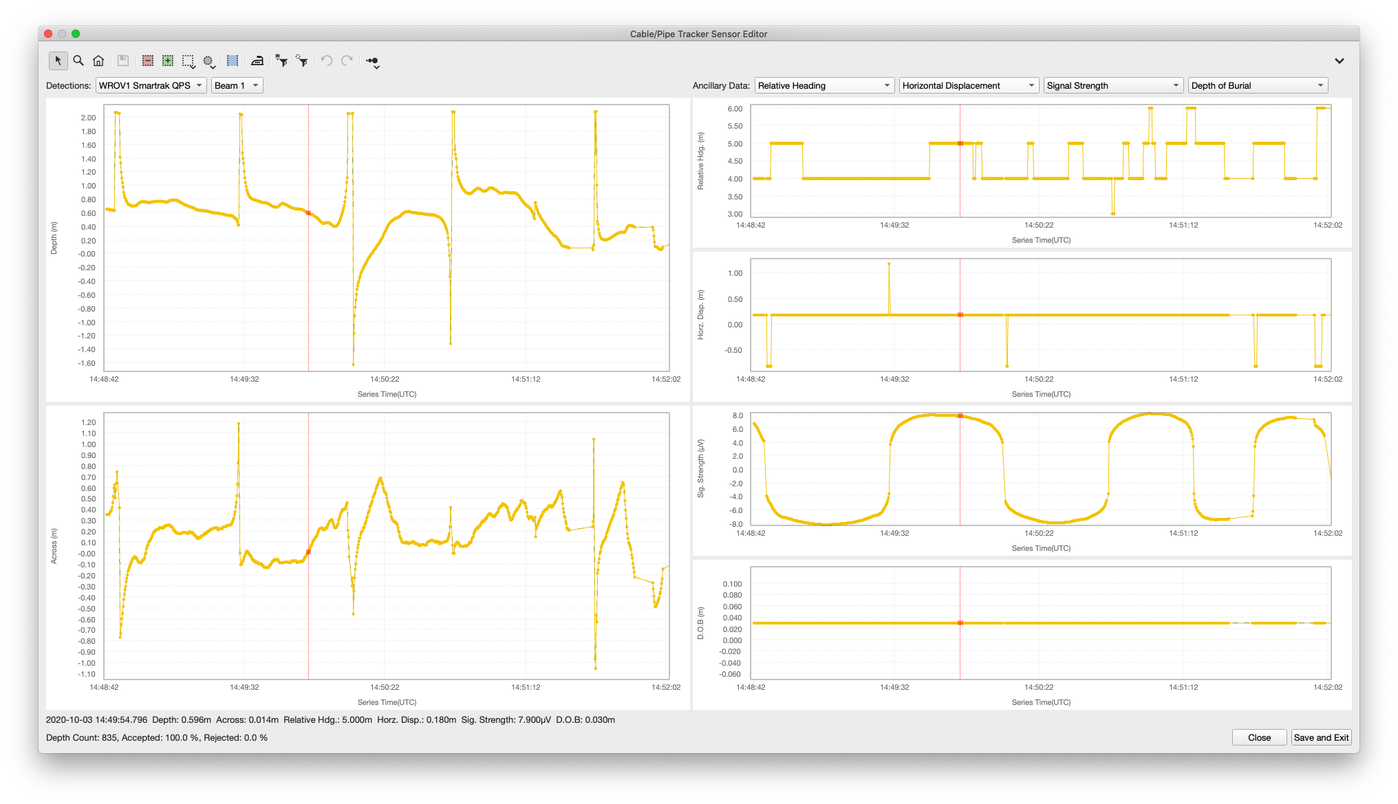 Cable/Pipe Tracker Sensor Editor showing the detections depth and across track values as well as any ancillary data that can be used to improve the detection results