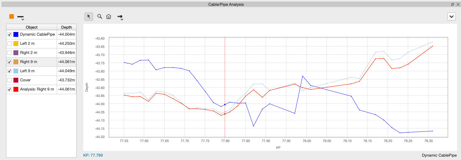 The Cable/Pipe Analysis Tool is accessed from the context menu of your Dynamic Cable/Pipe object. This tool allows for review the top of product and x-point listings to determine if the cable/pipe is buried or exposed. If you want to quickly scan your TOP detections for review, use the mouse cursor in the plot and the red ball will display that location in the 3D Scene. A quick ctrl + left click will center the scene on the specified KP. In this tool there are two options for computing the depth of burial, a single reference line or an average of two reference lines. These can be x-point listings or an imported reference line. The depth of burial computation also allows for smoothing the results with a boxcar moving average.