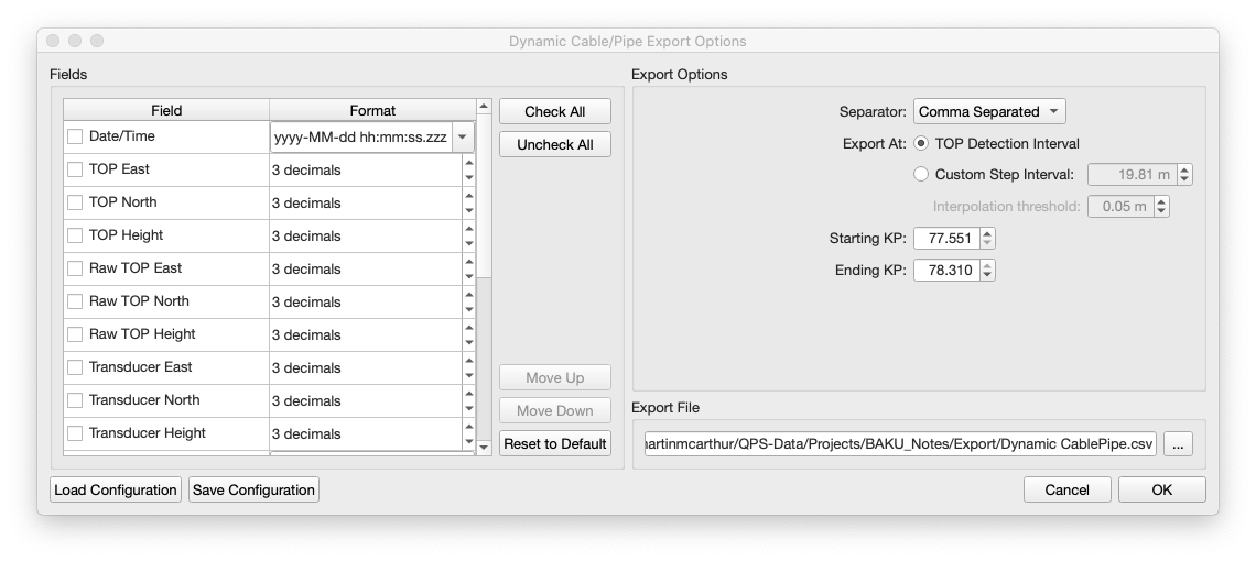 After reviewing the TOP detections and calculating the depth of burial, you can export the results to ASCII in a fully customizable export dialog. Here you can select and re-order all of the computed fields, use the TOP detection interval or a custom step interval, and specify a starting and ending KP range. The configurations you choose can be saved and loaded for future projects.