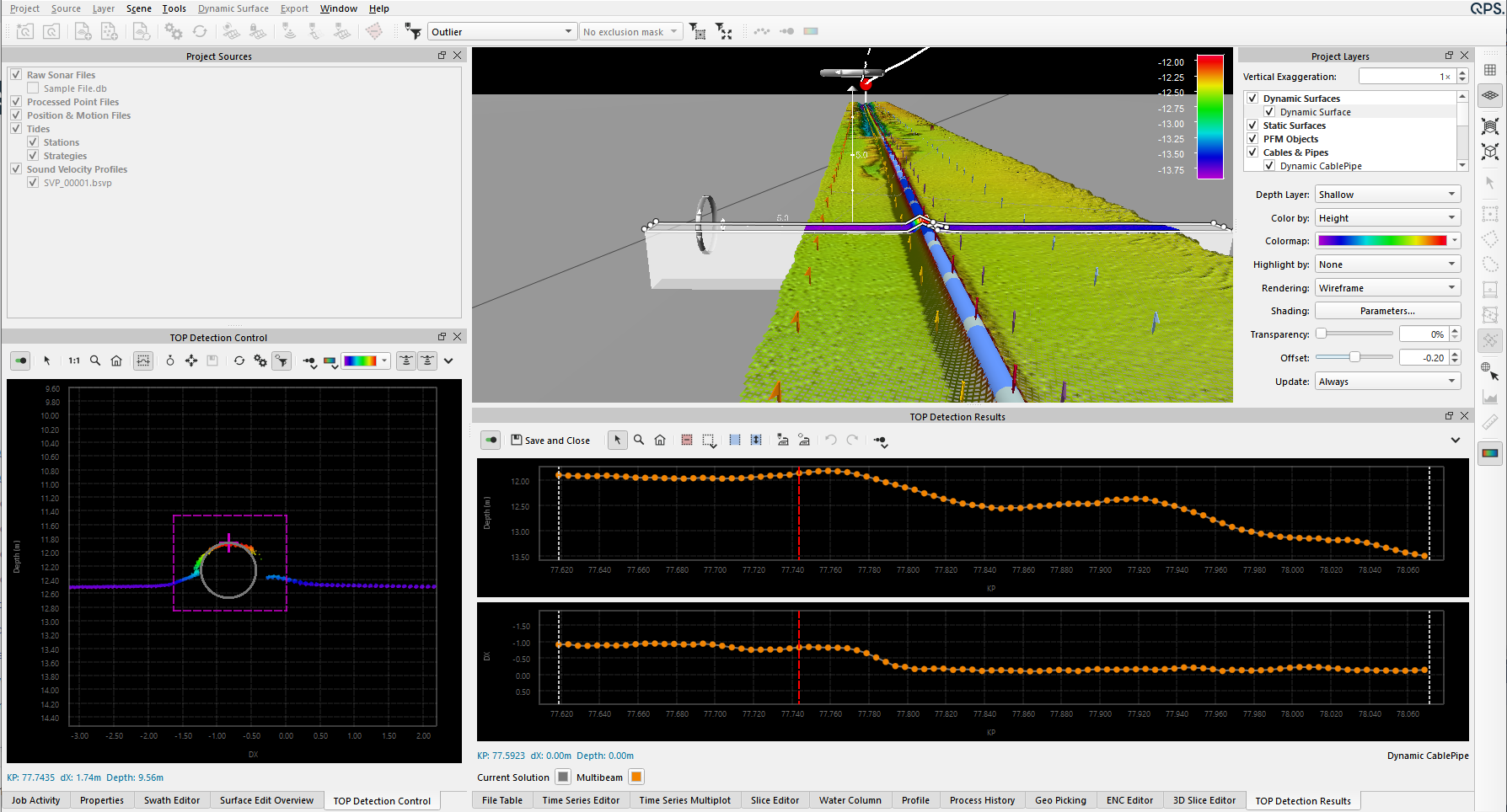 The cable/pipe tracker sensor editor loads selected lines and displays the detections stored in the QPD and raw ancillary data for Smartrak and TSS cable/pipe tracker systems. You can view, edit or filter, and smooth the QPD detections to improve the quality of your results. In this tool, manually rejecting or accepting points as well as applying the results from min/max clipping filters will apply changes to the QPD ping. Smoothing via boxcar moving average or LOWESS locally weighted scatterplot can be done on the depth and/or across track final solution. Any edits or smoothing will update the QPD files and associated dynamic surfaces automatically. The edited and smoothed results can be used directly by the cable/pipe TOP detection tool for detecting cables or pipes.