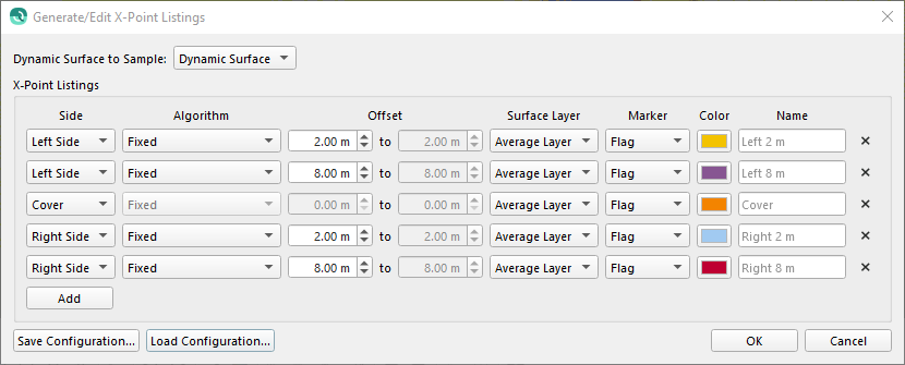 After the cable or pipe has been detected and saved to your project, Qimera has added the ability to generate a variable number of X-Point Listings as well as saving and loading different configurations. X-Point listings are sometimes referred to as cross sections in Qinsy. In this dialog you can generate 3/5/7/9 or whatever configuration you want and specify the different parameters necessary. Once the X-Point listings are generated they will show up in the 3D Scene with the marker type and color specified. The X-Point listings are later used for cable or pipe analysis and during export to ASCII.