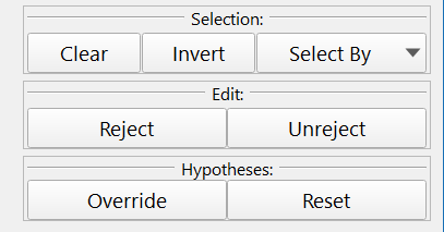 The Control Bar on the right hand side changes slightly when the Cube toggle is enabled. Click the Clear or Invert buttons to modify the selected hypotheses. Clicking the Reject button will delete the hypotheses in the currently selected bins. The Unreject button will undelete hypotheses that