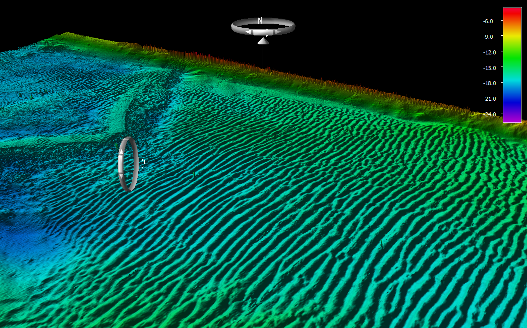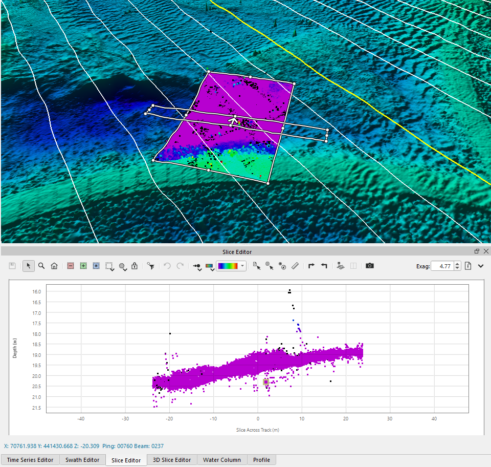 As you move along the pings in the selected track line, the 4D Scene will update to show the swath contents and location.