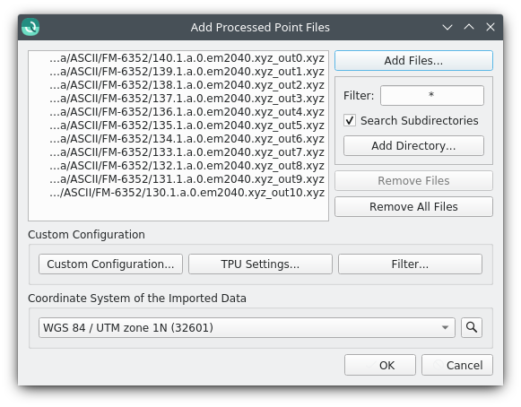 Point file data can be entered either by clicking on the 'Add Files...' button, 'Add HIPS Files...', or by clicking on the 'Add Directory...' button. Clicking on the 'Add Files...' button will bring up a file selection dialog and multiple files can be added at once. Clicking on the 'Add Directory...' button will bring up a directory selection dialog. This will recursively add any supported Point File Data. In the case where there are multiple supported Point File Data, a filter can be specified in the Filter Edit field. For a list of all supported processed point files, please see .Qimera Data Format Specific. Clicking on the 'Add HIPS Files...' button will bring up a directory selection dialog followed by the Add HIPS Files dialog.