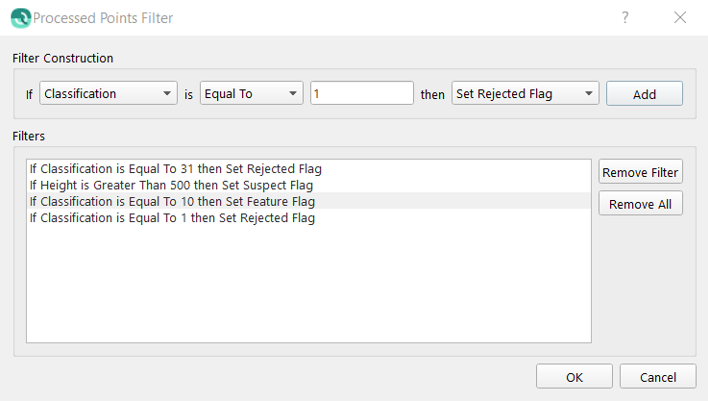 Clicking the Filter Button will launch the Processed Points Filter. This dialog allows the construction of filters during the Processed Point file import process. When files are imported the constructed filters will be applied to the data and reduce manual editing overhead. Constructed filters will be saved for the current import session only and cannot be recalled once the import process has started.